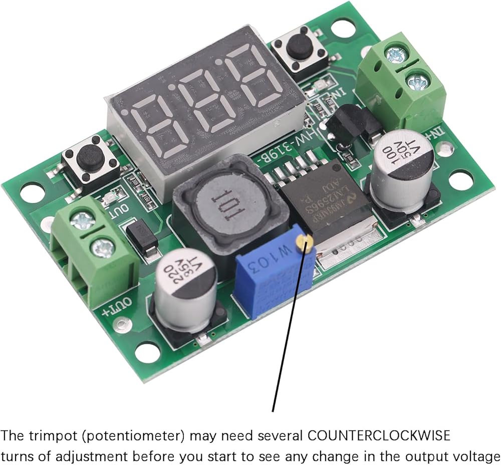 NOTE: the trimpot (potentiometer) on this module may need several COUNTERCLOCKWISE turns of adjustment before you start to see any change in the output voltage.