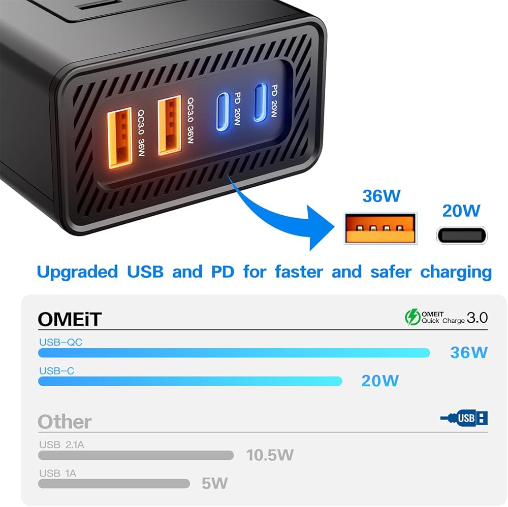 ⅴ: تم تجهيز منافذ شحن USB سريعة الشحن-عاكس موجة جيبية معدلة بمنافذ شحن سريعة USB-QC 3.0 36W (MAX) و USB-C 20W (MAX). يكون منفذ PD أسرع 6x من شاحن 2.4A ، مما يسمح لك بشحن ما يصل إلى 4 أجهزة في وقت واحد ، بما في ذلك الهواتف وأجهزة iPad و MacBooks وغيرها