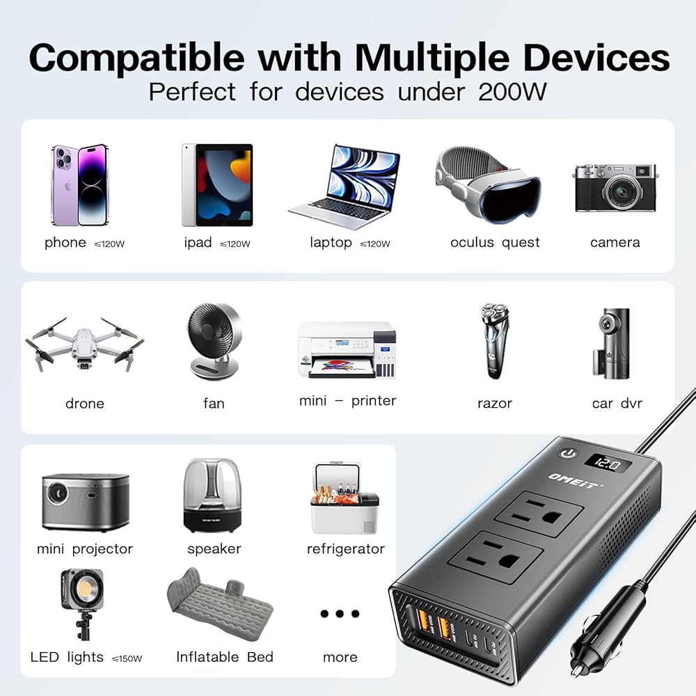 ⅰ: حل الطاقة متعددة الاستخدامات: تحويل 12 فولت DC من بطارية سيارتك إلى AC 110V مع عاكس الطاقة 200W الخاص بنا للسيارات ، ويتميز بمنافذ USB 2XPD 20W و 2XQC 36W ، ومنافذ AC 2 ، وكابل 23.8 بوصة مع قابس أخف سجائر. يحتوي محول AC 12 فولت إلى 110 فولت أيضًا على شاشة LED ذكية ، مما يوفر تحويل طاقة فعال ومريح لأجهزتك أثناء التنقل