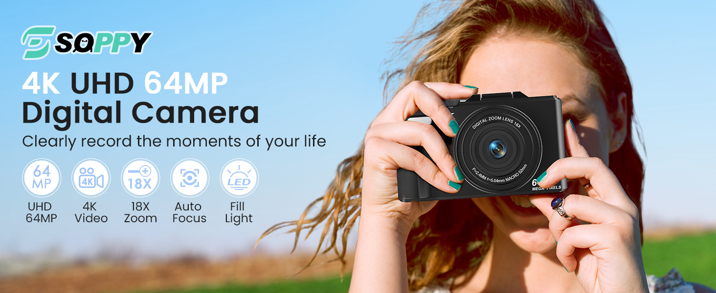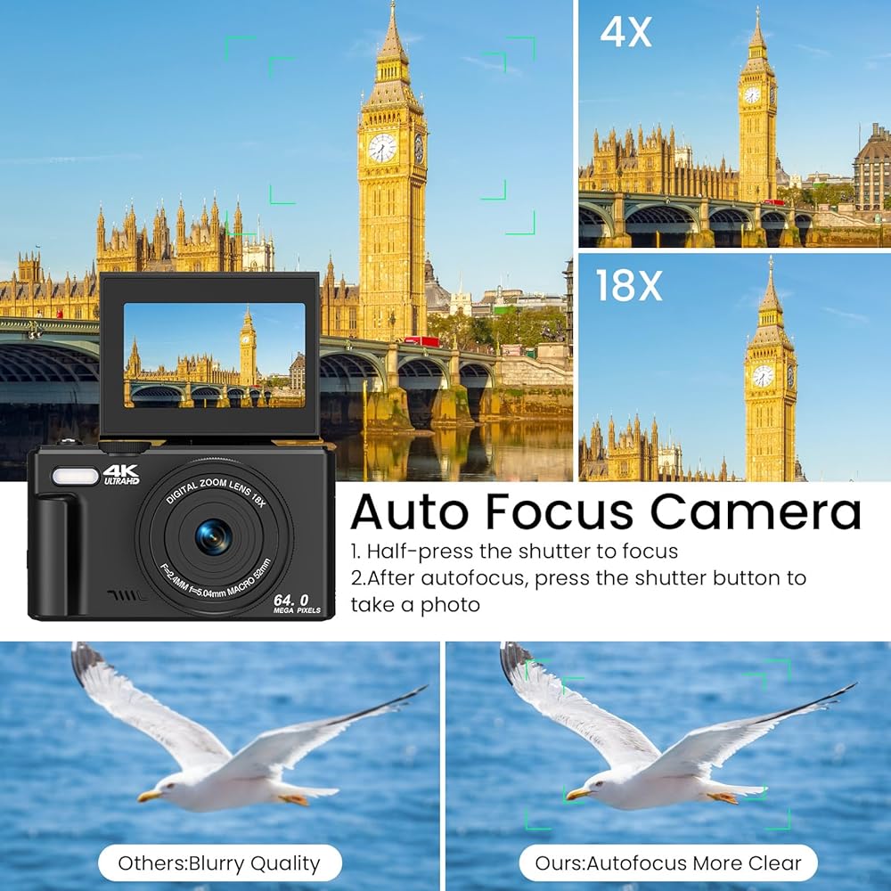 UHD 4K & 64MP Digital Camera: This digital camera has an HD video resolution of 4K and an image resolution of 64MP to significantly improve image sharpness and capture clear videos. This rechargeable photo camera can help you capture the most exciting and memorable moments and give you high-quality pictures or videos.