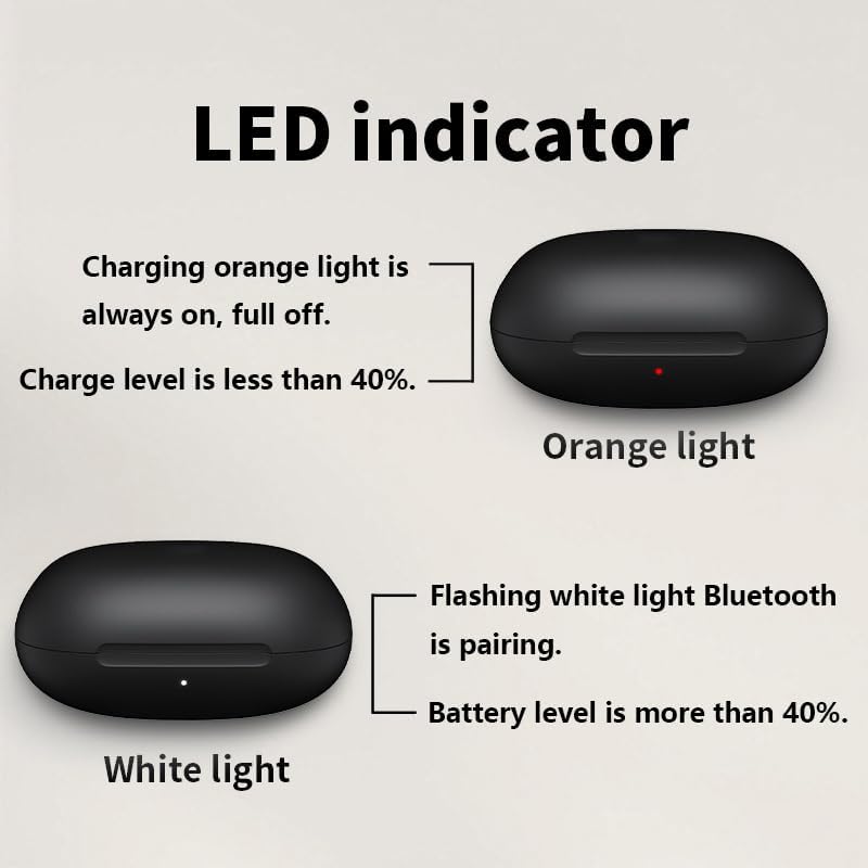 • 【مؤشر LED الثلاثة للألوان】- تم تجهيز حالة الشحن بثلاثة مصابيح مؤشر LED التي تعرض مستويات البطارية في كل من العلبة وسخور الأذن ، مما يجعلك على اطلاع بحالة الشحن في جميع الأوقات.