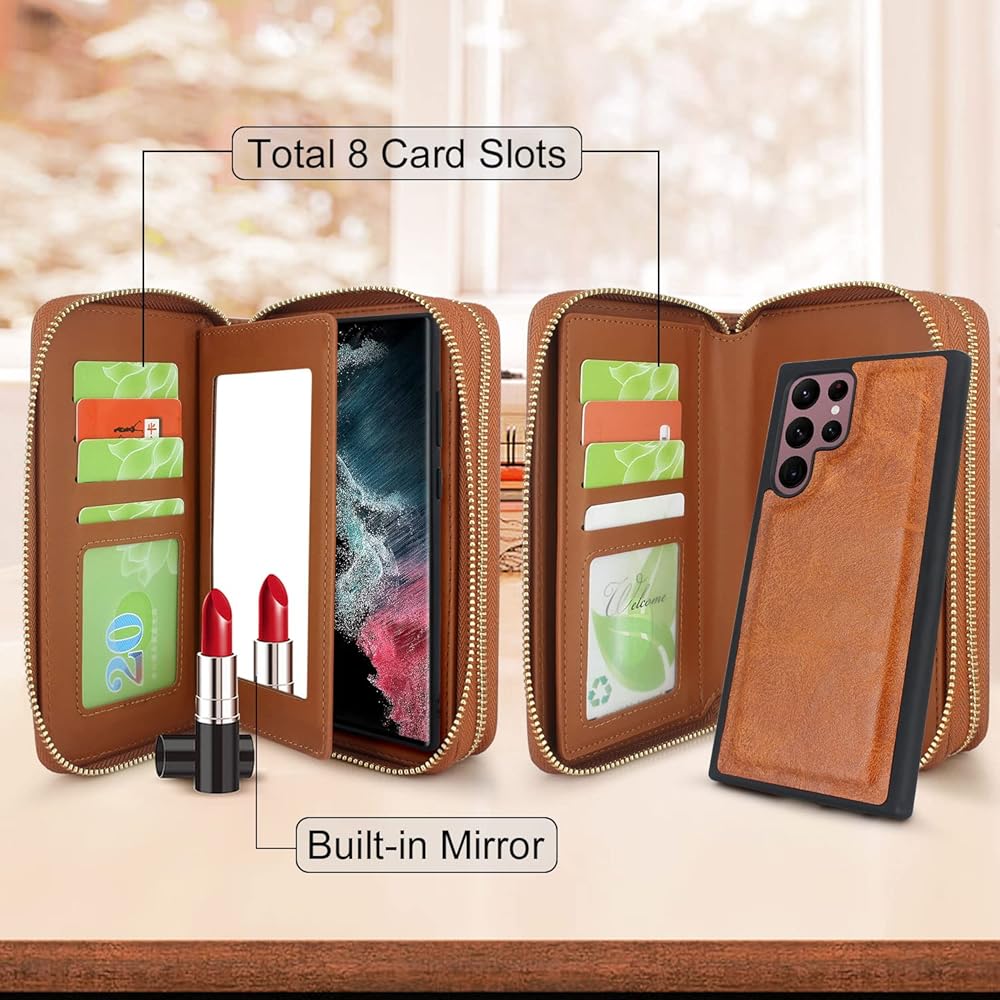 8 فتحات بطاقة ومرآة بوليت و 3 جيوب سستة. مساحة كافية للنقد والعملة المعدنية والتغيير والإيصالات أو أحمر الشفاه النحيف أو المفتاح أو كابل USB أو سماعة الأذن أو أي شيء صغير آخر ، حتى هاتف صغير الحجم.