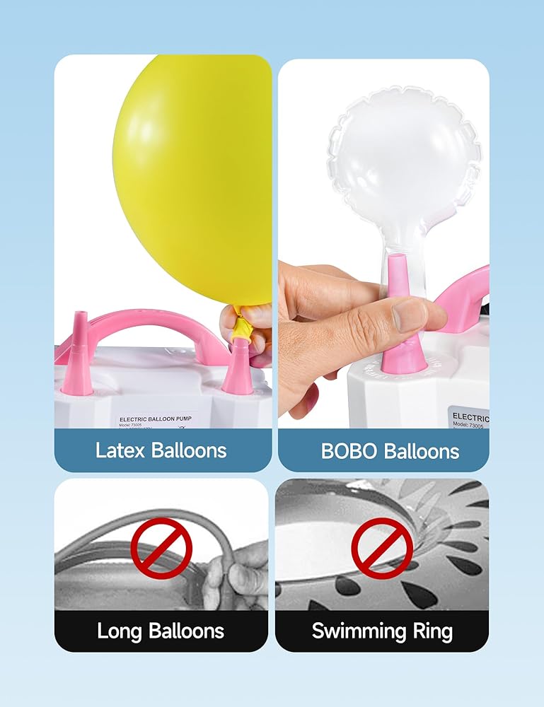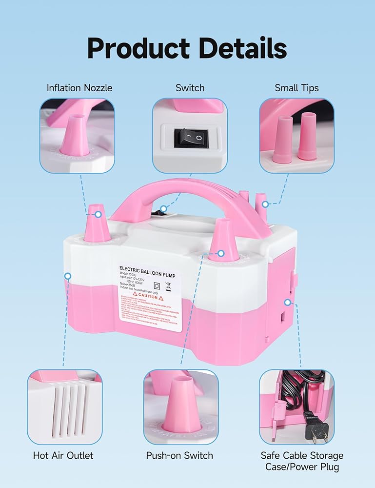 تتميز أوضاع بدء التشغيل المزدوجة للتضخم المخصص على كل من وضع النقر التلقائي الواحد ووضع الضغط على الأوتوماتيكي: اقلب المفتاح لتدفق الهواء المستمر ، وهو مثالي لتضخيم البالونات السائبة بسرعة وتوفير الوقت على الإعدادات الكبيرة ؛ اضغط مع الاستمرار على زر START للتحكم الدقيق ، ومنع التضخم المفرط ومثالي للبالونات الزخرفية الصغيرة أو التصميمات التفصيلية.