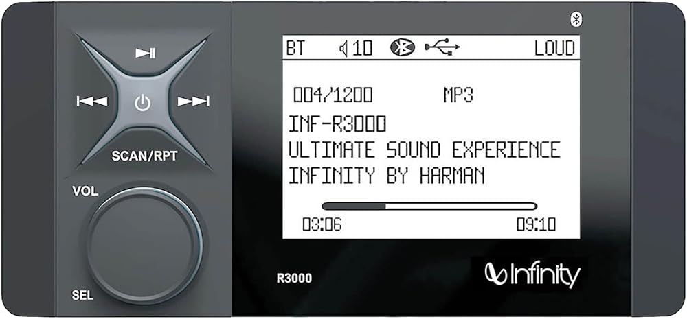 PACKAGE BUNDLE INCLUDES: Infinity 4" LCD Display Bluetooth Marine AM/FM Rear AUX/USB Digital Media Stereo Receiver with Protective Stereo Cover, 22" Wired Radio Antenna