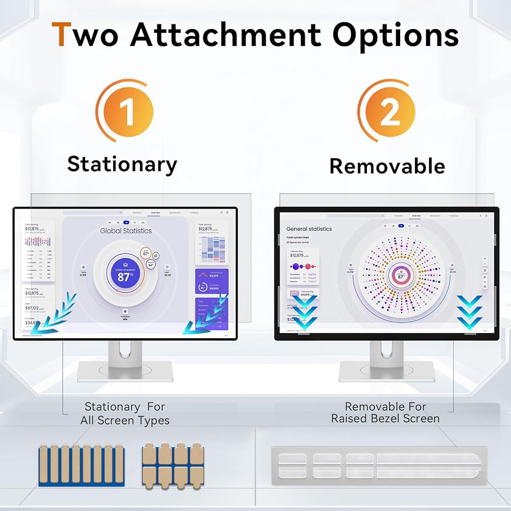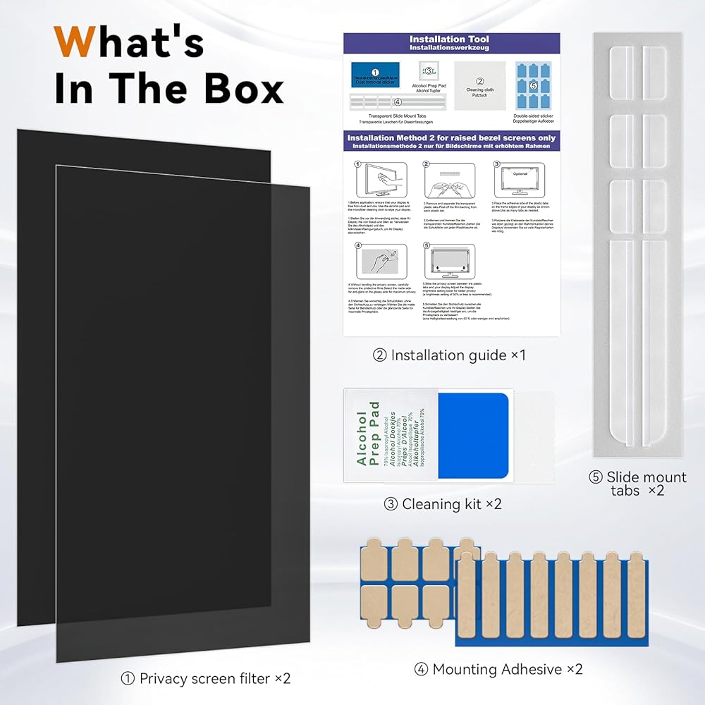 • 【TWO INSTALLATION OPTIONS】 1) Apply clear adhesive stickers directly on the monitor privacy screen filter to hold it in place on the monitor screen itself; 2) Install these plastic slide mount tabs on the outer rim of the screen to hold the privacy screen in place (for computer screens with a raised bezel only), allowing you to slide the filter on and off the screen as needed. All accessories and installation instructions are included in the packaging.