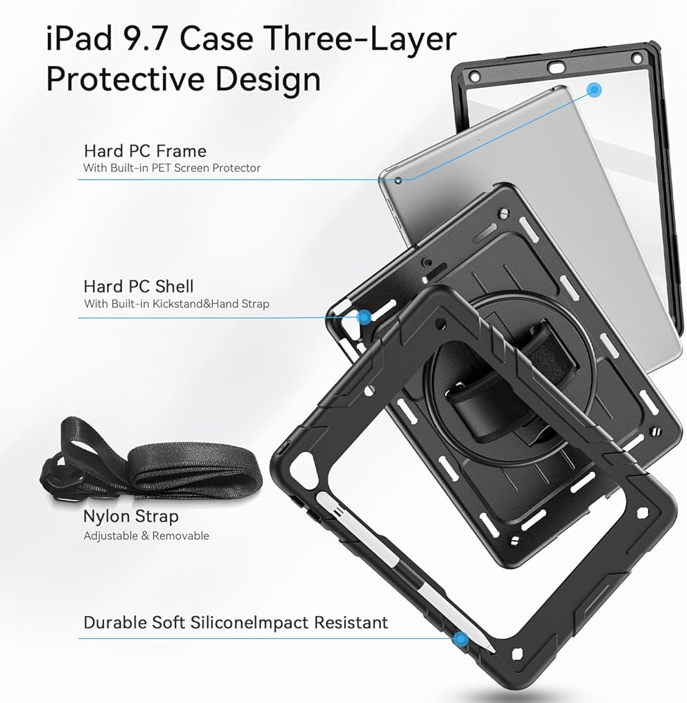 Case for iPad 6th/ 5th Generation 9.7 '' مع حامل قلم الرصاص على الشاشة [360 حزام يدوي دوار] والوقوف ، حالة مقاومة للمنزل لـ iPad 6th/ 5th/ Air 2/ Pro 9.7 (أسود)