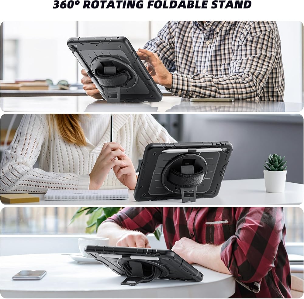 • 【360 درجة من Kickstand & Hand Strap】 Kickstand القابلة للتدوير تدعم بسهولة جهاز iPad في عرض متعدد الزوايا.