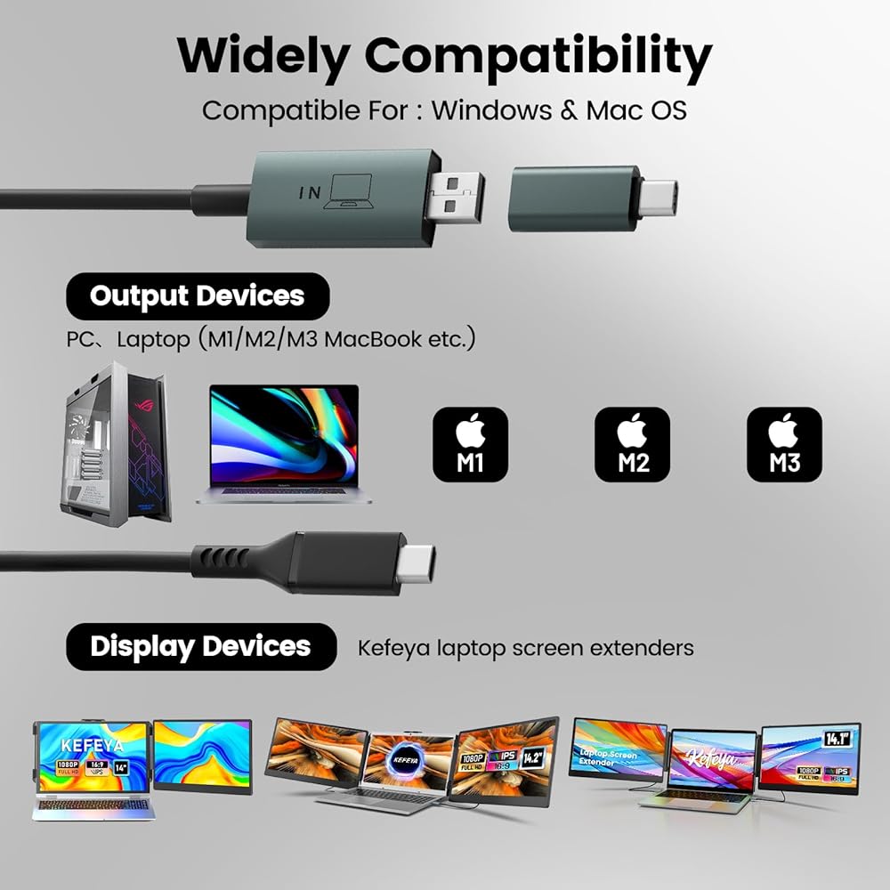 H5-T is a 2-in-1 USB data to video signal conversion cable that supports connecting most laptops to Kefeya laptop screen expanders (S1/S2/S3/P1/P2). It solves compatibility issues between M1/M2/M3 MacBooks and laptop screen extenders. This cable is compatible with Windows & MAC operating systems. Simple to operate, after installing the driver, you can transmit video signals, watch HD videos or slideshows. If you are using a MacBook with an M1/M2/M3/M2 Pro chip in your laptop, or if it lacks a video out port, then you can pick up the H5-T cable along with this portable screen extender.