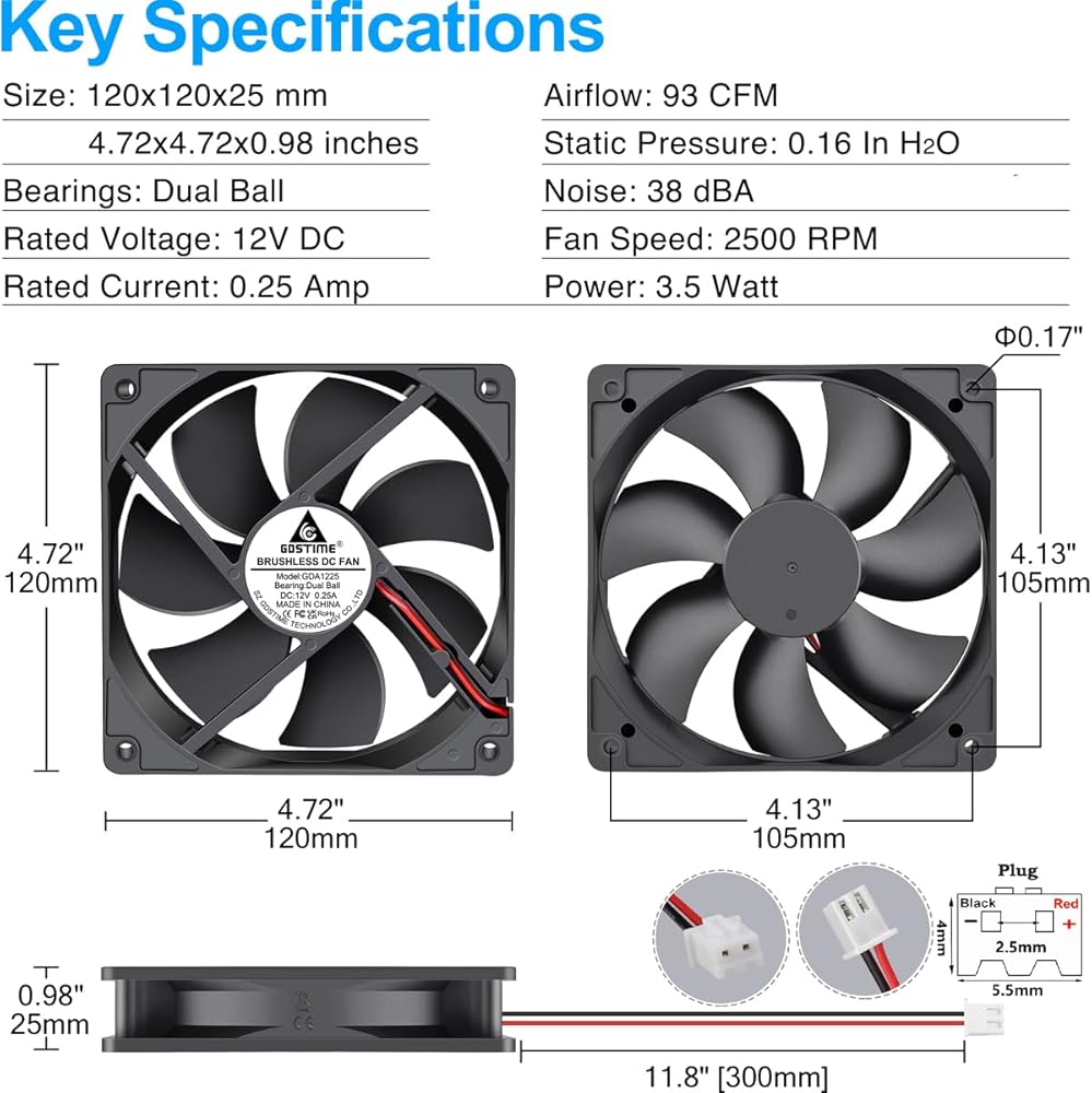 • 12V 12025 Fan Specs: 120 x 120 x 25 mm ( 4.72 x 4.72 x 0.98 inches ) | Rated Voltage: 12VDC | Rated Current: 0.25A | Power: 3.5 W | Speed: 2500 RPM | Noise: 38 dBA | Airflow: 93 CFM | Static Pressure: 0.16 In H2O