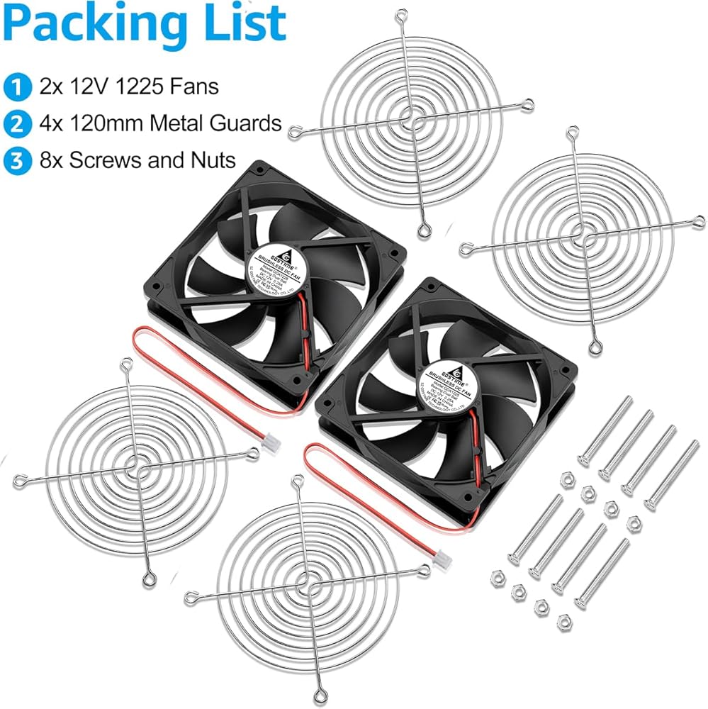 • Easy to Use: Includes 2pcs 120x120x25 mm 12v dc axial cooling fans; 8pcs long enough mounting screws and nuts; 4pcs 120 mm metal fan grills to protect your fingers and fan blades; 120x25 mm fan size is ideal for computer cases and other chassis ventilation (intake & exhaust)