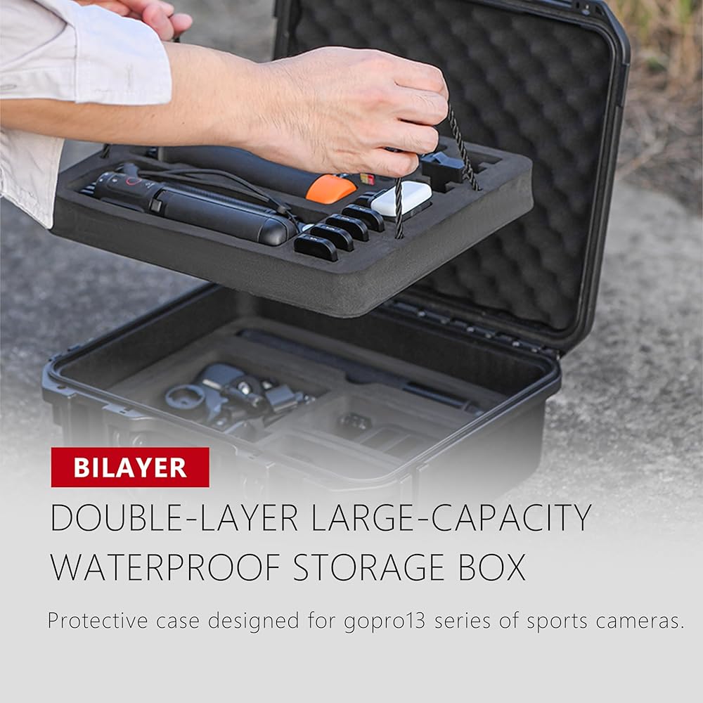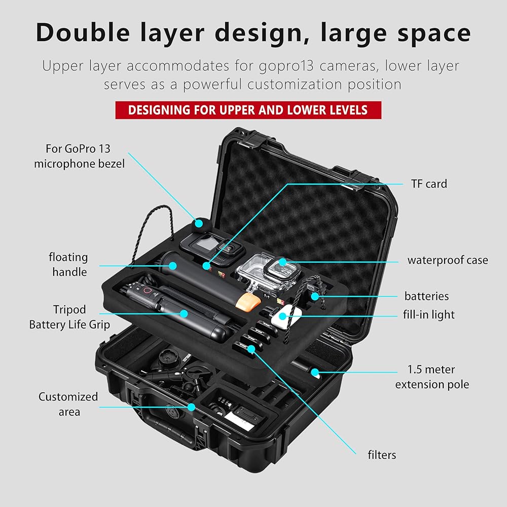 Large Capacity Storage: Upper layer holds for GoPro 13 (with media mod), waterproof case, 4 batteries, 4 filters, buoyancy rod, fill light, check mount, electric handle, short selfie stick. Lower layer customizable for extension rods, selfie sticks, and other accessories with removable bracket for DIY adjustments.