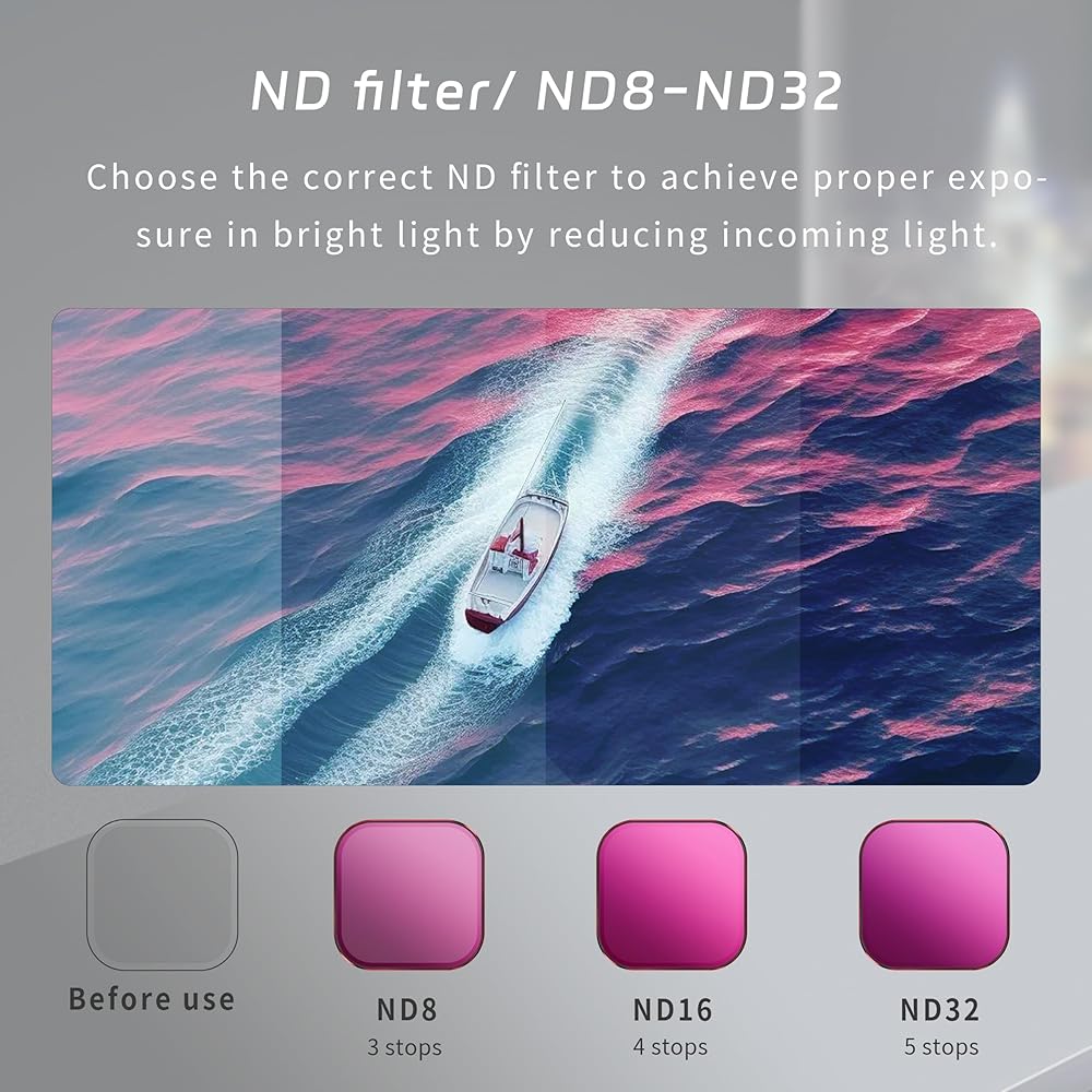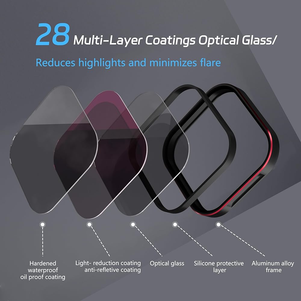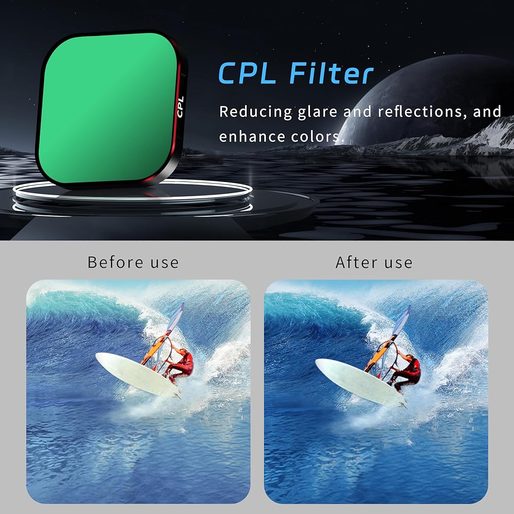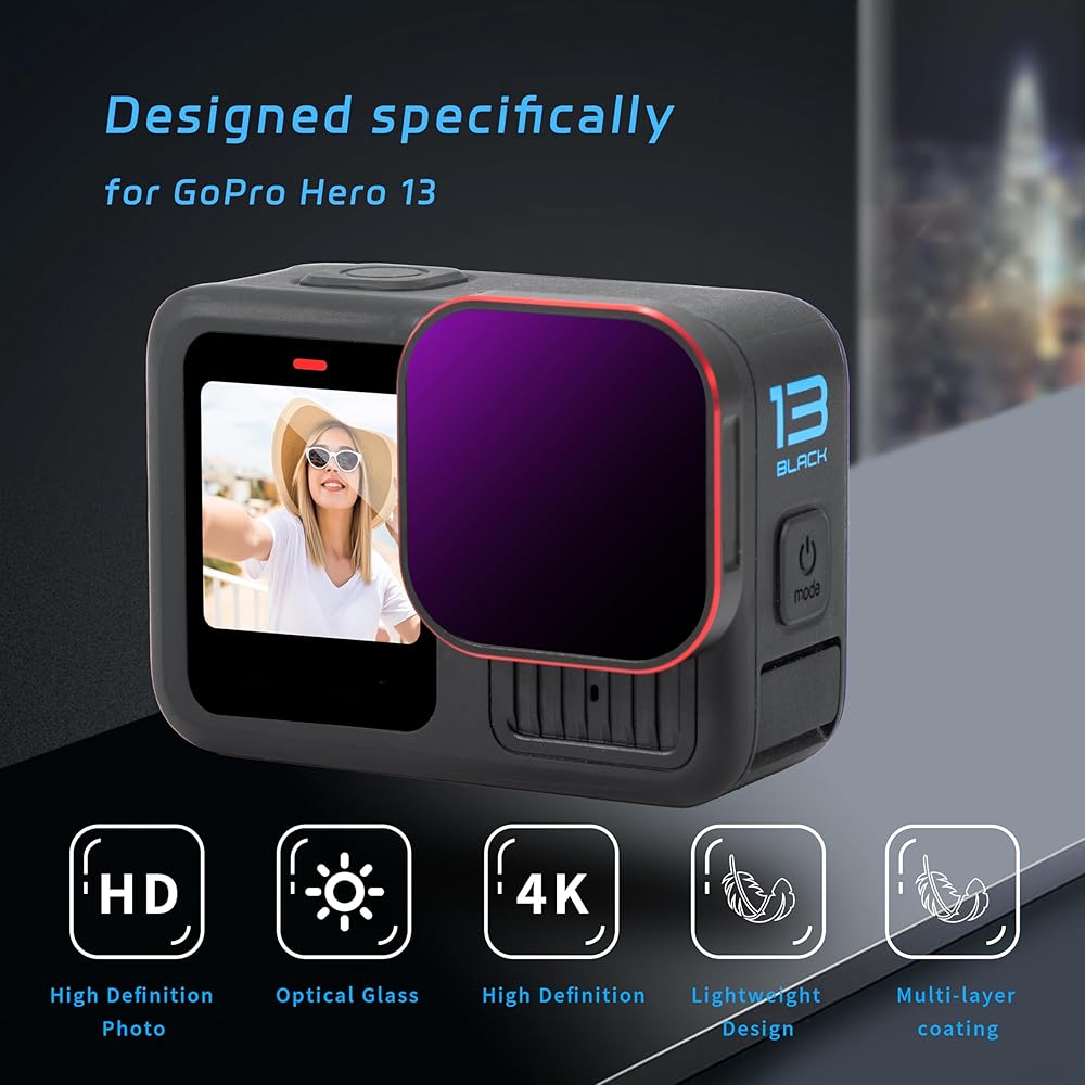 ND Filters Set Designed for GOPRO Hero 13: Multi-layer coating, waterproof, scratch resistant, dustproof, and oil resistant, protecting for GOPRO 13 lens from all-round damage. Meeting the dual needs of ND dimming lenses and CPL polarizing lenses, multiple filter effects can be selected during shooting, including ND8/ND16/ND32 and CPL lenses.