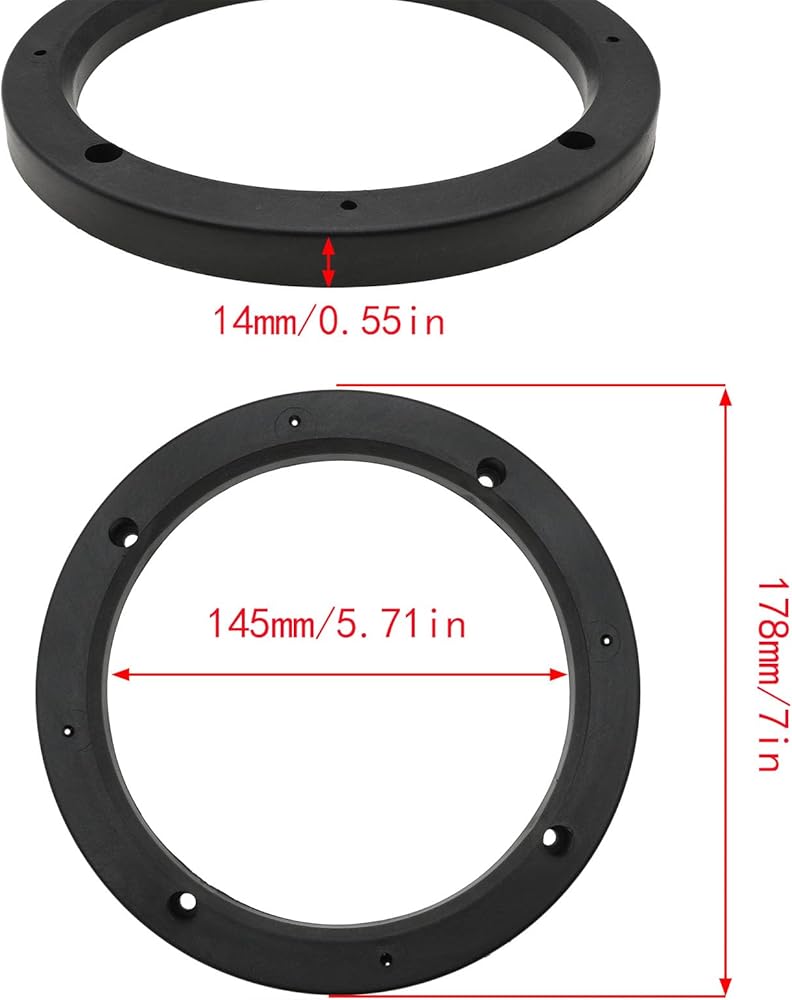 6.5 inch speaker spacer bore: 144mm /5.67 inches; Outer diameter: 180 mm /7.09 inch; Thickness: 15 mm /0.59 inches; Universal gasket for most 6.5 "speakers.