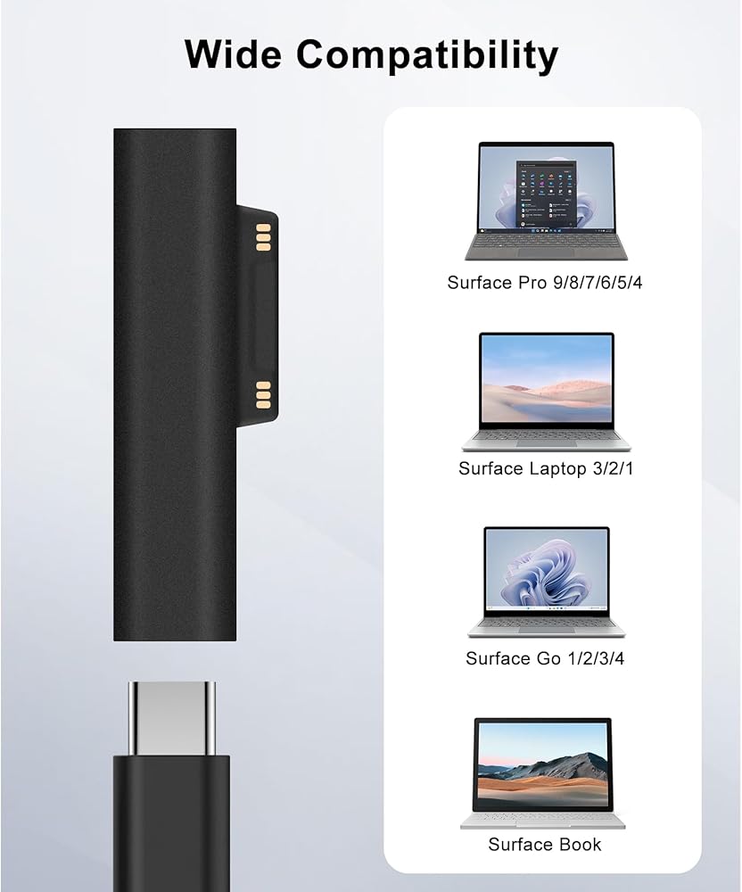 【التوافق الواسع】 متوافق مع Microsoft Surface Pro 9/8/7/6/5/4 ، الكمبيوتر المحمول السطحي 3/2/1 ، الكتاب السطحي ، الكمبيوتر المحمول السطحي 5 ، الكمبيوتر المحمول السطحي 4 ، Surface GO والأجهزة الأخرى. واجهتها المغناطيسية ، مع ضوء مؤشر الشحن ، يتم امتصاصها تلقائيًا عند إدراجها ، وليس من السهل السقوط ، ويتم تشغيل ضوء المؤشر عند تشغيله
