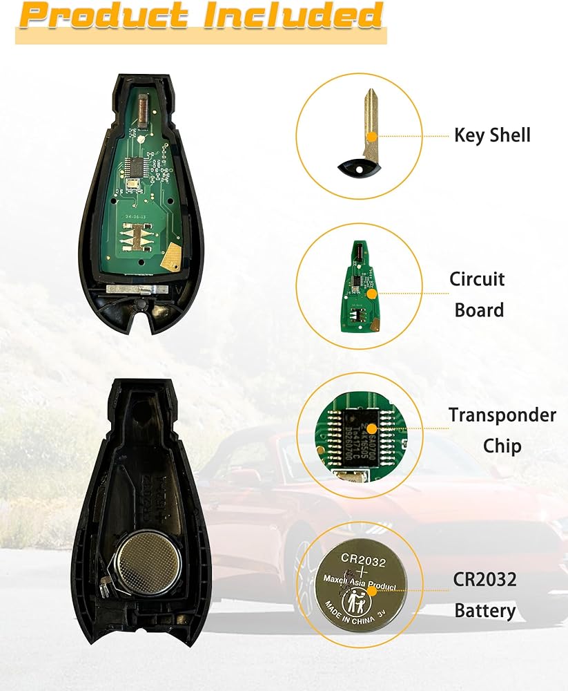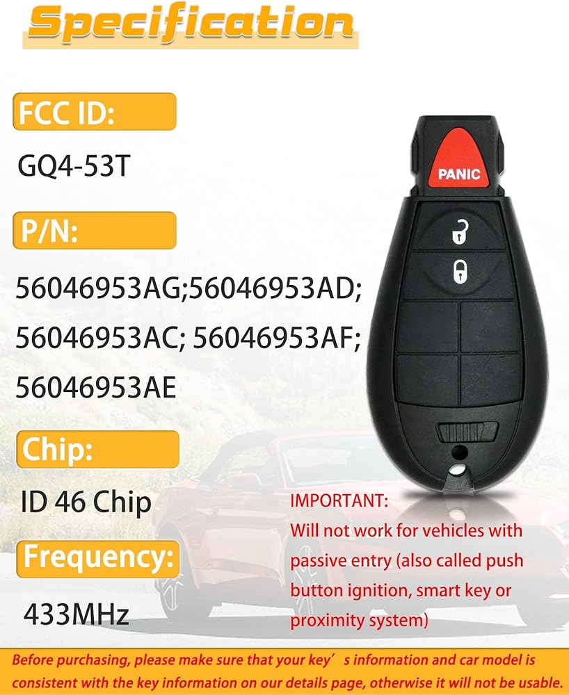 • استبدال: مفتاح FOB متوافق مع معرف FCC: GQ4-53T ؛ P/N: 56046953AG ، 56046953AD ، 56046953AC ، 56046953AF ، 56046953AE ؛ التردد: لن يعمل 433 ميجاهرتز للسيارات مع الدخول السلبي (يسمى أيضًا PEPs ، وضغط زر الإشعال ، أو المفتاح الذكي أو نظام القرب)