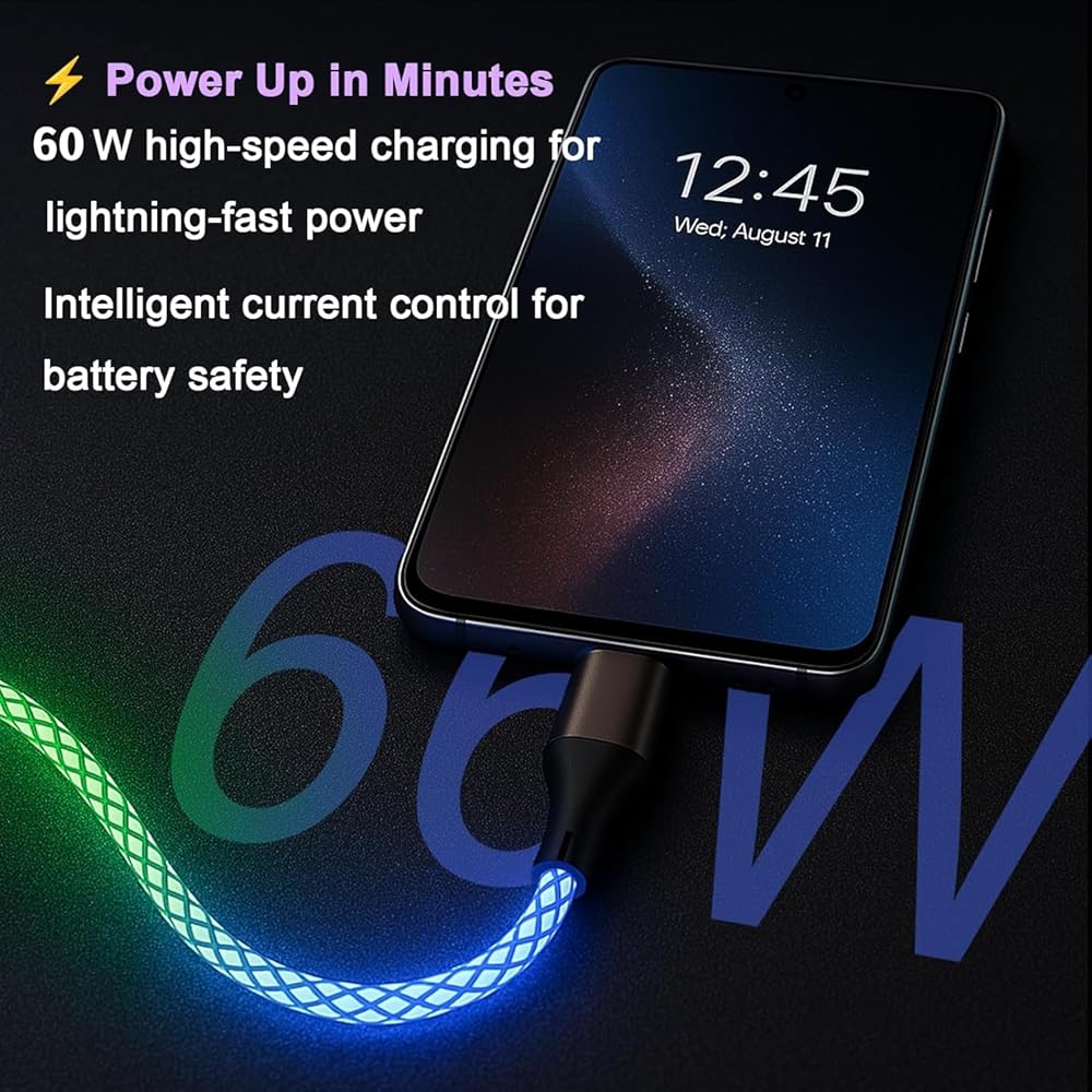 💡【6tf Fast Charging & Data Sync】The cable Output up to 20V/3A,it supports Quick Charge 3.0 technology(Note: need match the QC3.0 charger)fast charging will shorten charging time. And 60MB/S (480Mbps) data transfer speed via USB 2.0. Special illuminating cable will light up like breathing when charging the phone, laptop, tablet or other device.