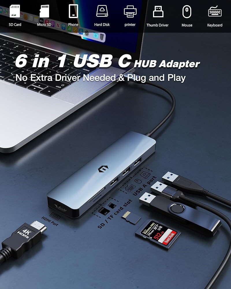 USB C Hub ، 6 في 1 USB C Adapter ، USB 3.0 ، 4K HDMI ، Dual USB 2.0 ، قارئ بطاقة SD/TF ، محطة الإرساء متوافقة مع أجهزة الكمبيوتر المحمولة MAC Pro/Air وأجهزة Type C الأخرى C.