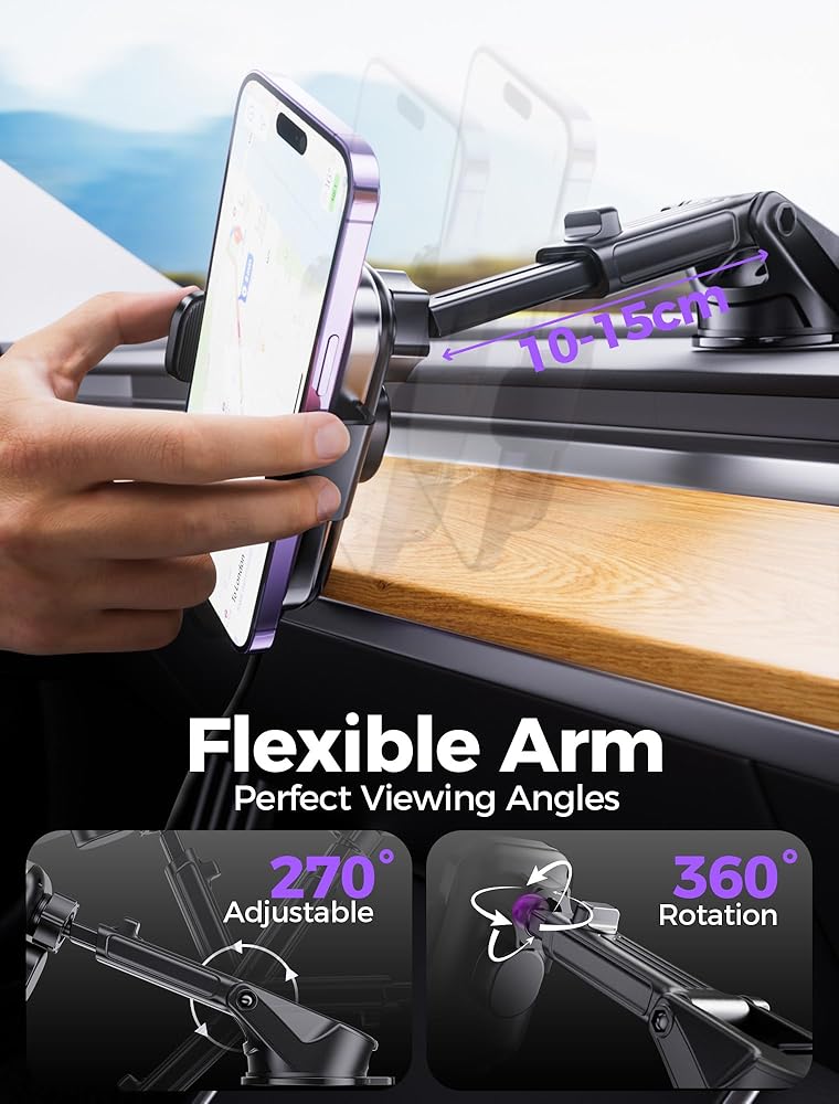 Adjustable Viewing Angles: Enjoy 360° rotation and an extendable telescopic arm for customized viewing. Switch easily between portrait and landscape modes without obstructing your view. Perfect for GPS navigation, music streaming, and calls, this design ensures safe and distraction-free driving.