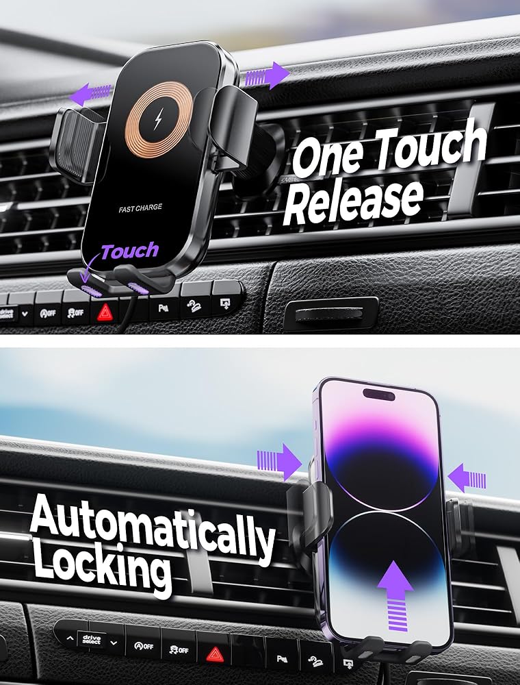Auto-Clamping & Smart Alignment: Place your phone on the holder, and the automatic clamping mechanism secures it instantly. The smart chip ensures perfect alignment with the charging coil, maximizing efficiency. Effortlessly release your device using the one-touch side buttons for hassle-free operation.