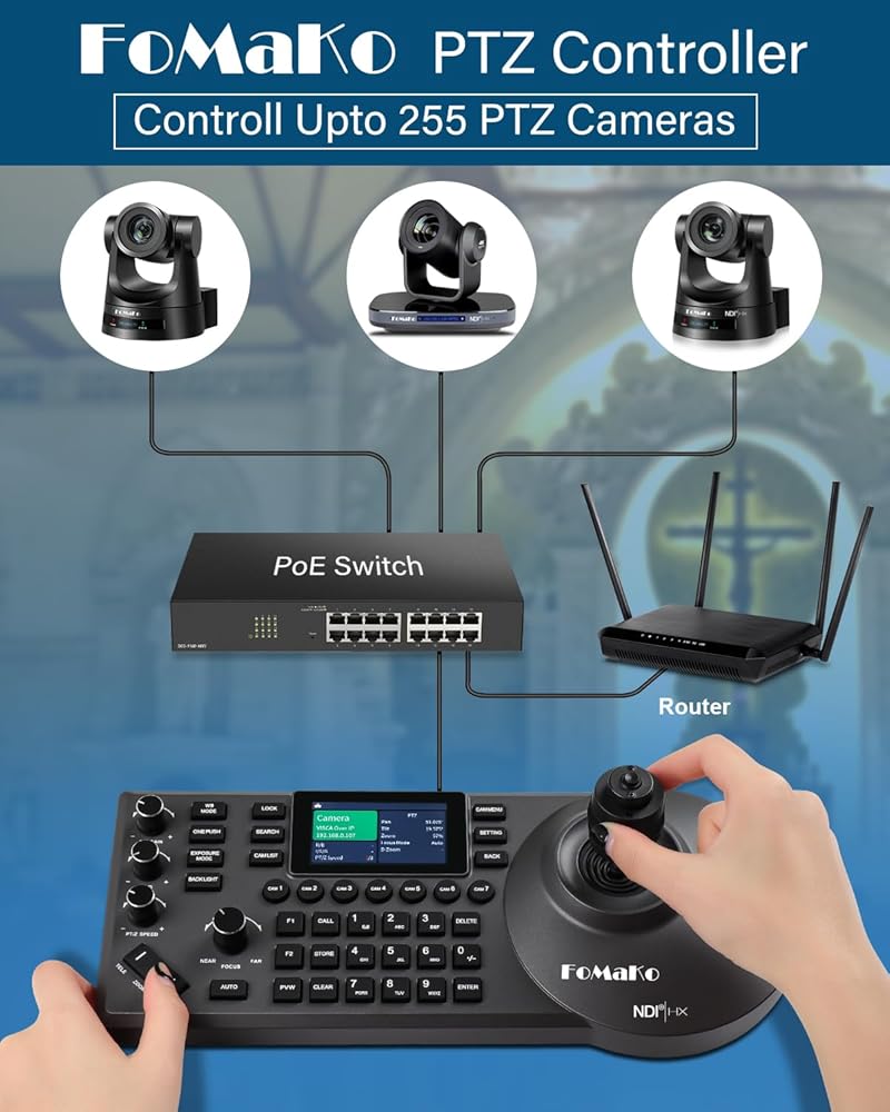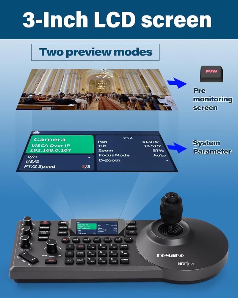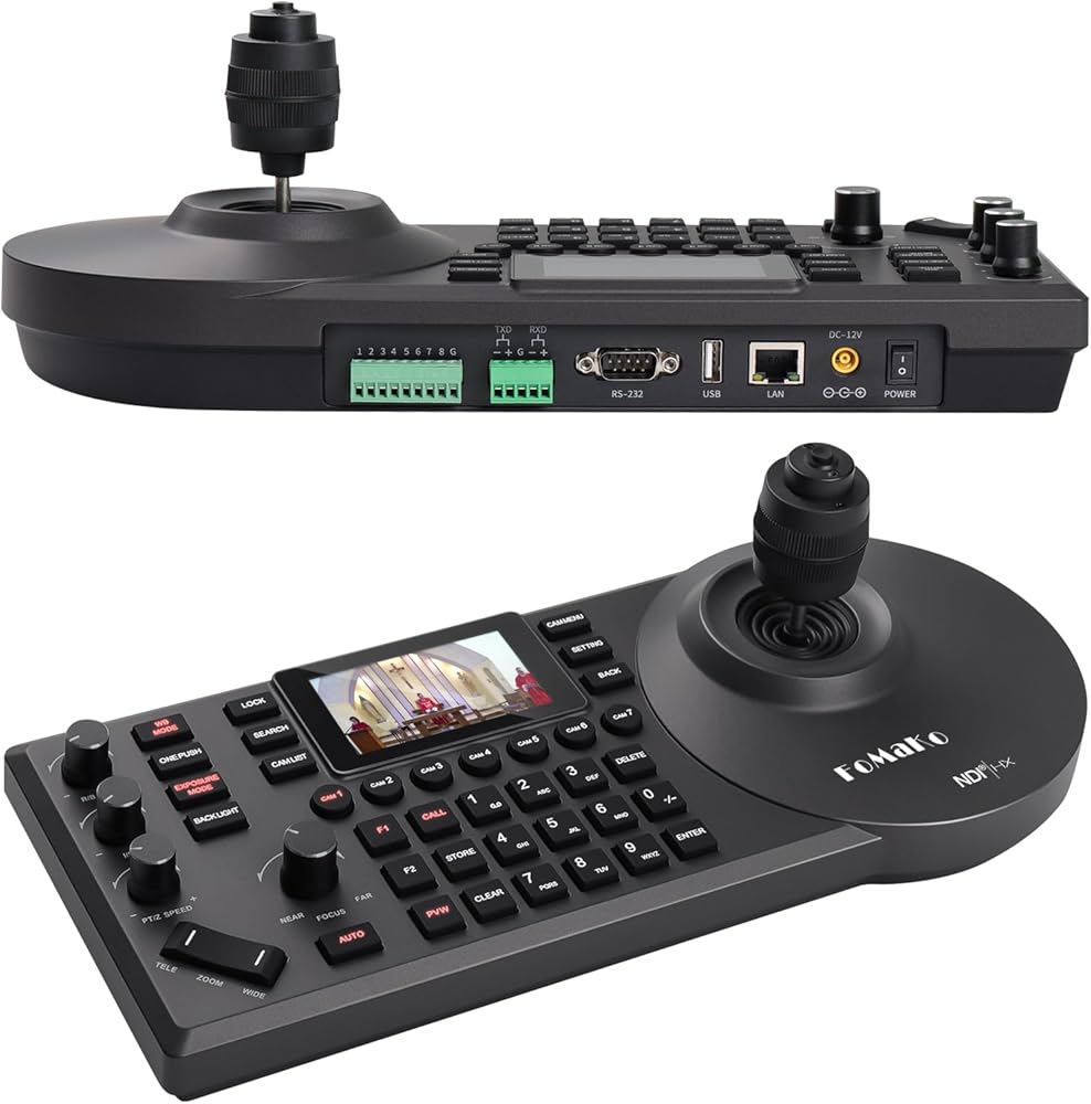 Fomako Ndi PTZ Controller ، عرض LCD 3 بوصات ، لوحة مفاتيح Poe PTZ Camera Controller مع 4D عصا التحكم في الكنيسة والعبادة ، التعليم ، البث التدريسي ، المؤتمر ، eSports ، وما إلى ذلك ، متوافقة تمامًا مع Visca و Pelco- P & D ، يدعم RS232 و RS422 و RS485 و RSERNET. السيطرة على IP.