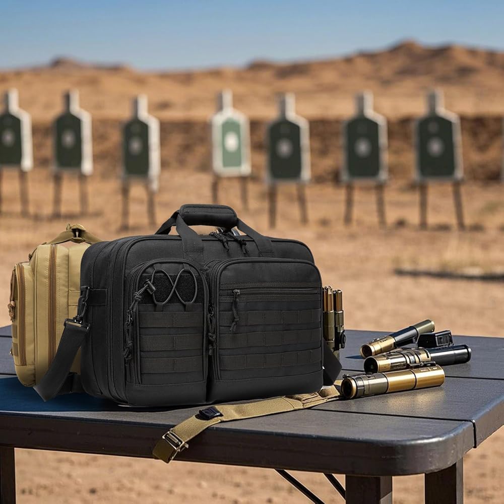 Durable & Spacious Storage: This tactical range bag is made from heavy-duty 600D nylon fabric for secure firearm transport. With compartments for 2+ pistols, 11 magazines, and range accessories like earmuffs and goggles, it's the perfect solution for your range day. The MOLLE system provides customizable storage for extra gear.