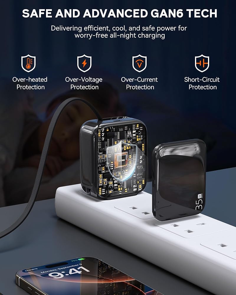 【الشحن السريع مع تصميم منفذ مزدوج】-شحن جهازين في وقت واحد مع كبل USB-C القابل للسحب ومنفذ USB-C إضافي. توصيل ما يصل إلى 35 واط عند شحن جهاز واحد ، فإنه يعمل على تشغيل جهاز iPhone 16 Pro إلى 75 ٪ في 30 دقيقة أو هواء iPad إلى 68 ٪ في نفس الوقت. للشحن المزدوج ، يتم تقسيم الطاقة بكفاءة مع الحد الأقصى للإخراج 15 واط لكل جهاز. لتحقيق أسرع سرعات الشحن ، يوصى بشحن جهاز واحد في وقت واحد.