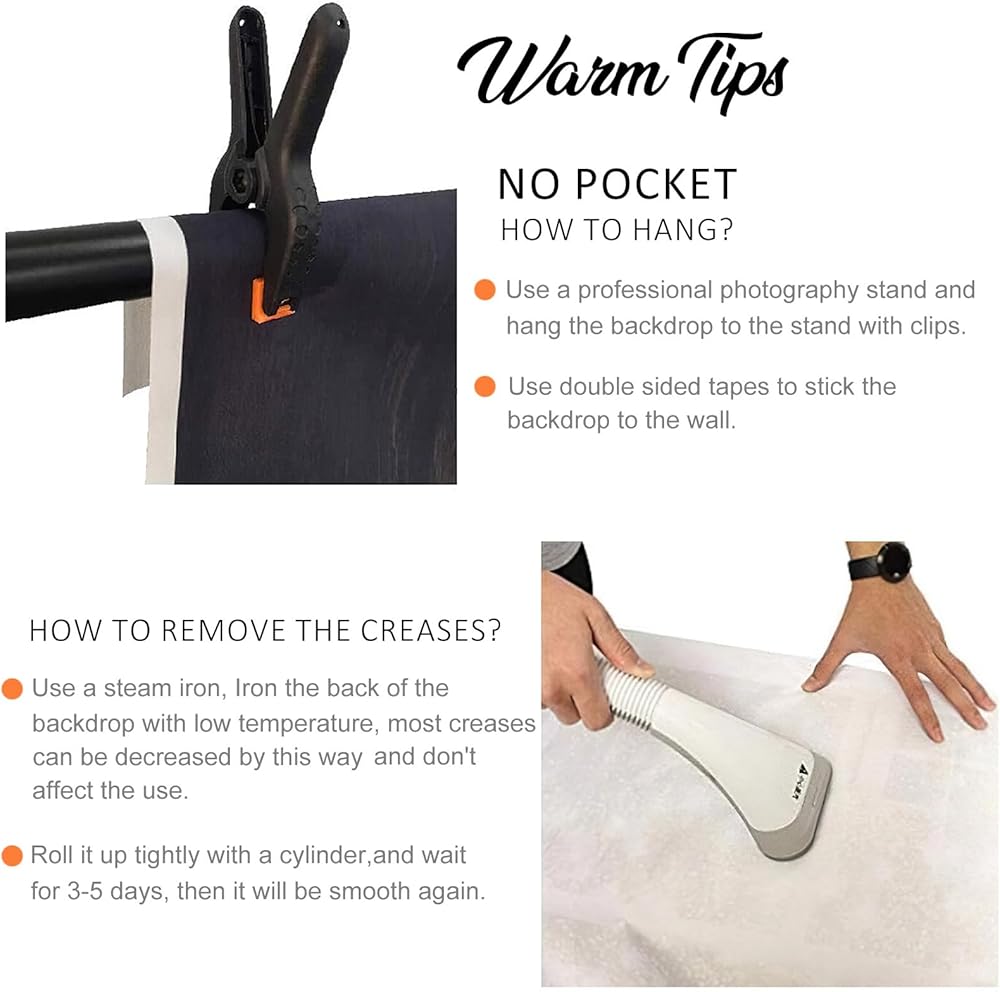 • 【WARM TIPS】1. There will be wrinkles because it is shipped by folded. You can iron the back surface with steam iron with low temperature, not dry iron. Then, the backdrop will be smooth again. 2. The backdrop is not waterproof, so don't wash it, you can wipe the stain with a damp cloth if it gets dirty.