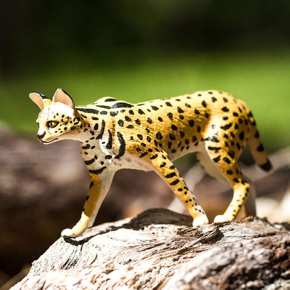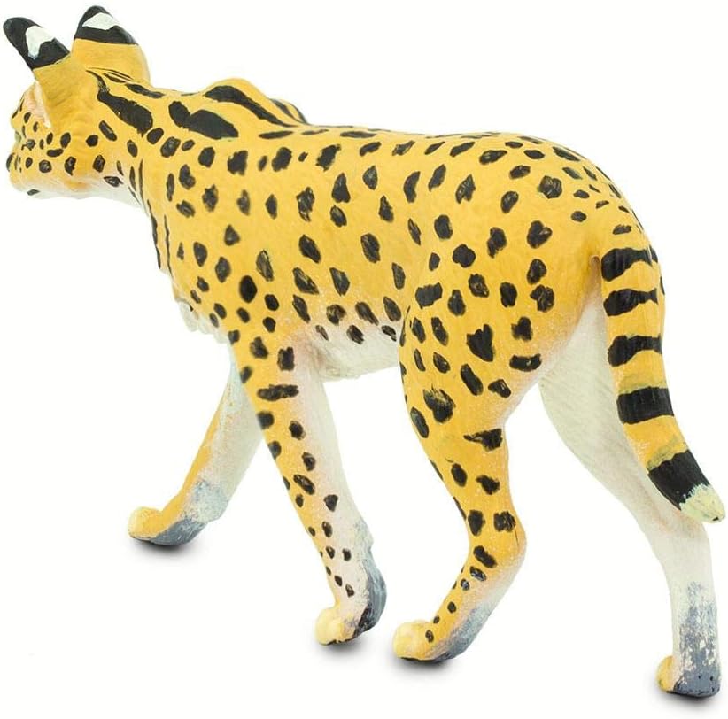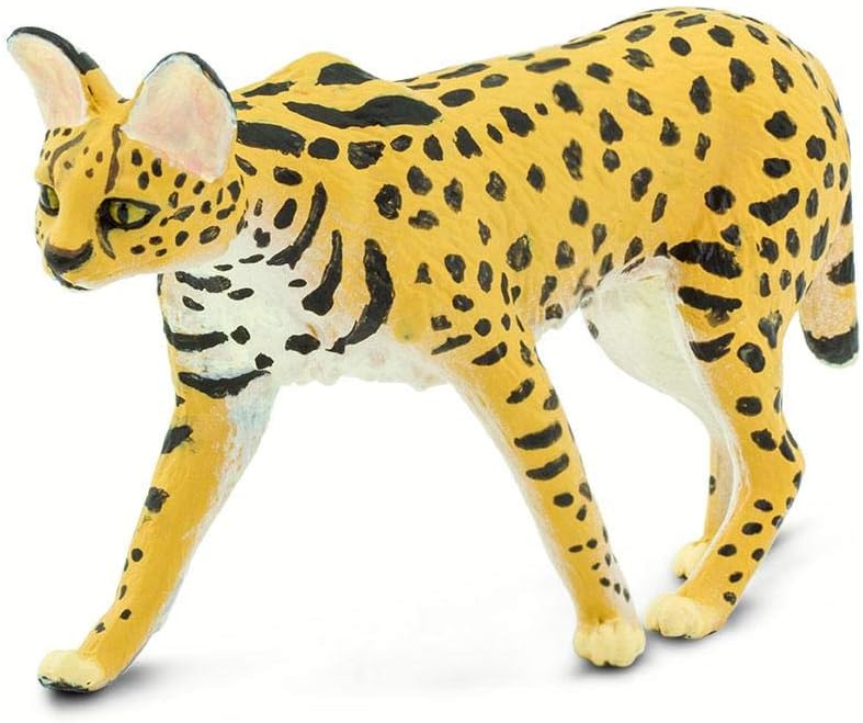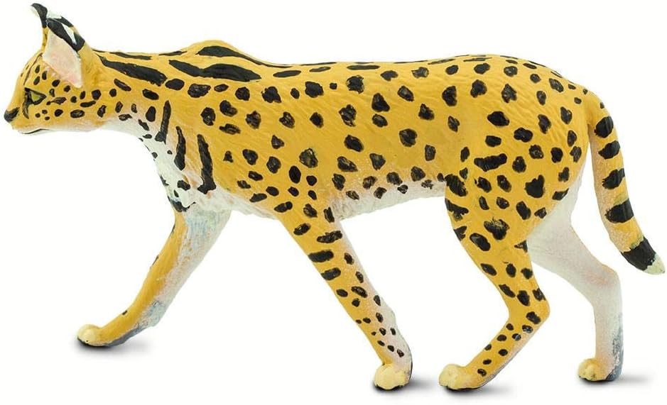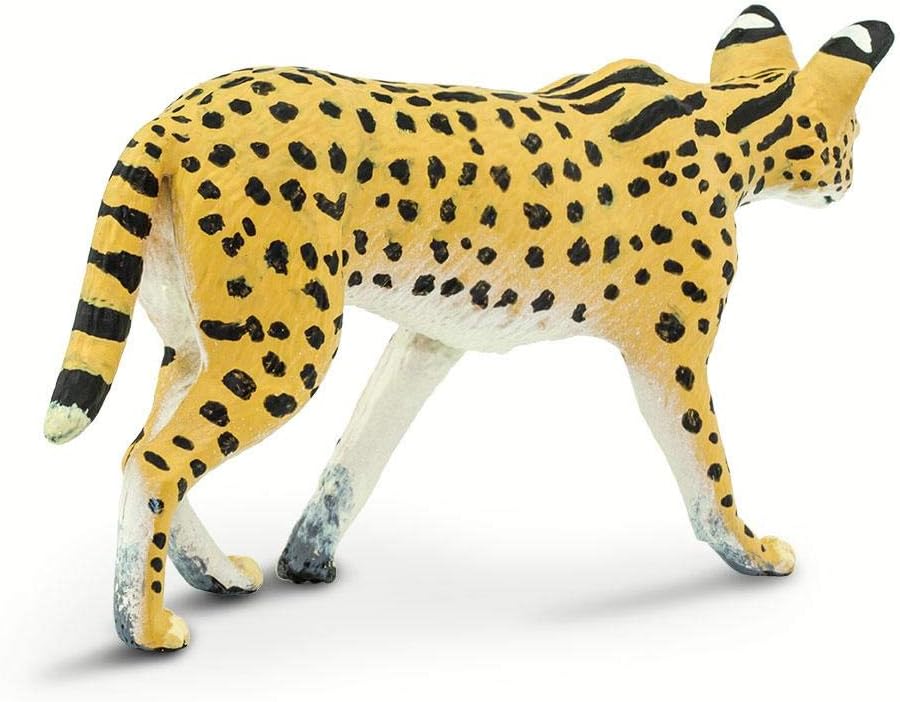 على الرغم من أنها متوسطة الحجم بين القطط، إلا أن سيقان طويلة بشكل غير متناسب ورأس صغير بأذنين كبيرة. تستخدم آذانها الحساسة للعثور على فريستها، ثم تعطلها عن طريق الانقضاض عليها، باستخدام أرجلها القوية لإطلاقها أكثر من ستة أقدام في الهواء. على الرغم من أنه نادر الحدوث في بعض المناطق، إلا أنه شائع في معظم أنحاء إفريقيا جنوب الصحراء الكبرى. يدرجه الاتحاد الدولي للحفاظ على الطبيعة (IUCN) على أنه نوع من "أقل قلقًا". ومع ذلك، مع انخفاض موطن الأراضي العشبية، يمكن أن تواجه سيرفال انخفاضًا محتملاً في أعداد السكان. مثل جميع منتجات سفاري المحدودة، تم طلاء هذا المجسم يدويًا بشكل فردي، ويتميز بهيكل عالي الجودة من مواد خالية من الفثالات والرصاص، ويتضمن بطاقة تعليق تعليمية بخمس لغات. مجسم واقعي وتعليمي وممتع، هذا المجسم مناسب لمجموعة من الاهتمامات، بما في ذلك هواة الجمع والمتحمسين والمعلمين والأطفال. استمتع بها على الرف أو استخدمها في الفصل الدراسي أو ببساطة استمتع باللعب بها. يبلغ طول مجسم سيرفال 3 3/4 انش وارتفاعه 2 انش، تقريبًا بحجم بطاقة الائتمان. جسمه أصفر، مع أبيض على جانبه السفلي وعلامات سوداء تغطي جوانبه وساقيه، وخطوط سوداء على ذيله ورقبته وظهره.