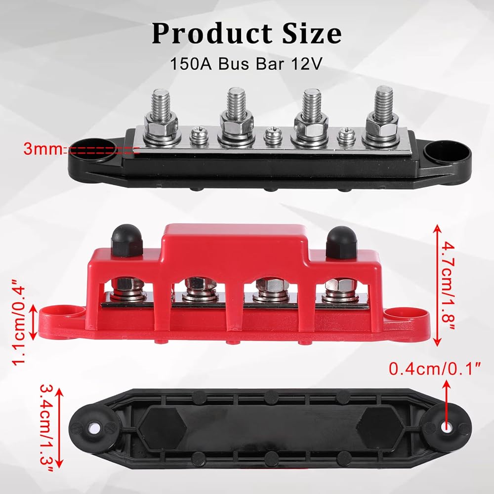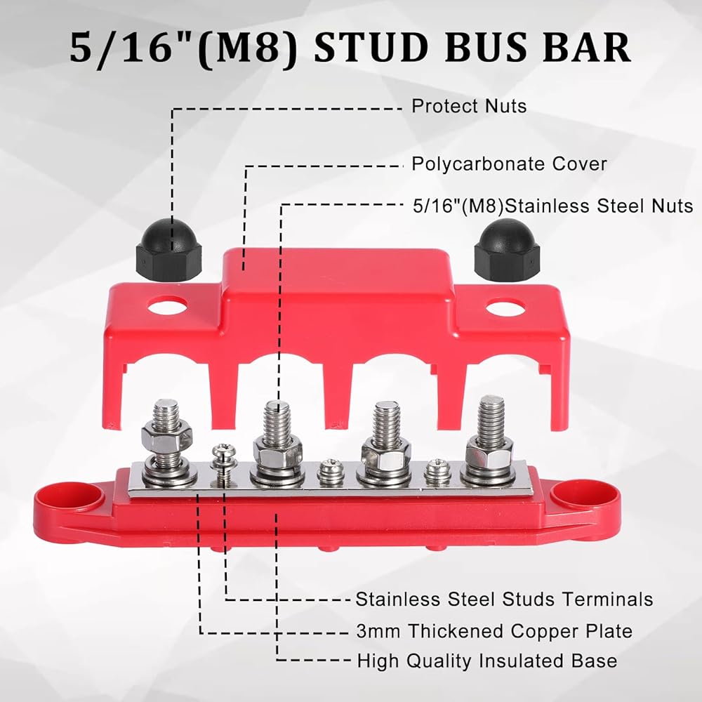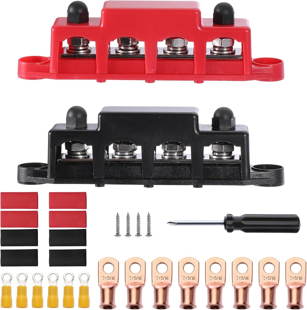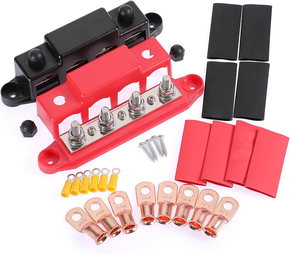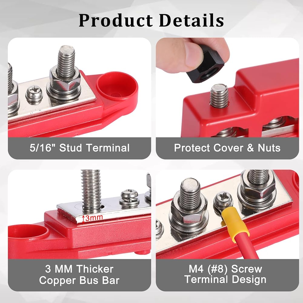 5/16 "محطة مسمار: شريط الحافلات 12 - 48 فولت مع محطة الأزرار 4 × 5/16" و 3 X #8 المسمار التي يمكن أن تقبل موصلات وأسلاك طرفية مختلفة. شملت الحزمة: كتلة توزيع الطاقة 1 زوج (أحمر وأسود) ، 1 × مفك البراغي ، 4 × مسامير تثبيت ، 8 × العروات النحاسية ، 8 × أنابيب تقلص الحرارة ، 6 × محطات معزولة