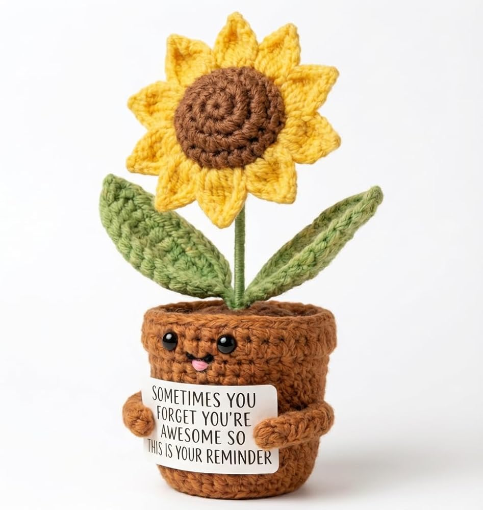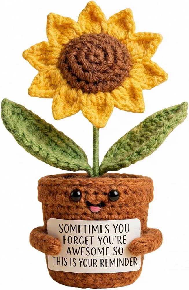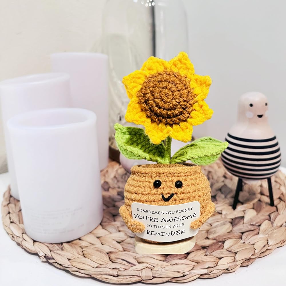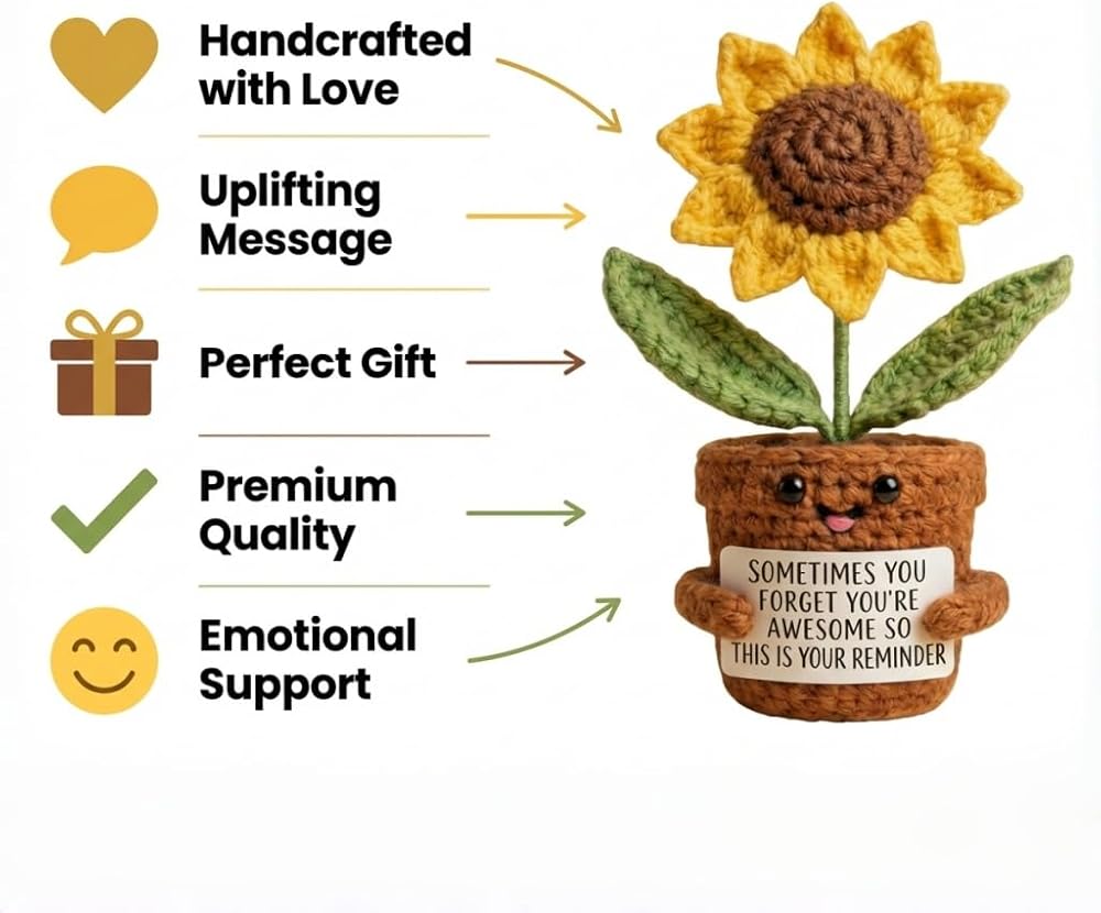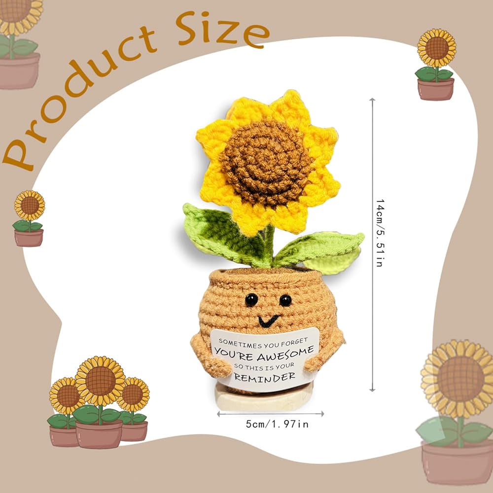 ابتسامات كبيرة من عباد الشمس: هذه الهدايا الإيجابية للكروشيه عباد الشمس ستحتضن أحبائك في عناق دافئ. هذا الشكر سوف يجلب بالتأكيد ابتسامة كبيرة على وجوههم. تبتسم الابتسامات والهتاف لها/يومه مع هذا الشكر للنساء! أخصائي اجتماعي مثالي ، موظف ، معلم ، أفضل صديق للهدايا التي ترمز إلى الإيجابية والصحة والسعادة. هذه الهدايا الملهمة عباد الشمس ترسلها/له أشعة الشمس والعناق والحب