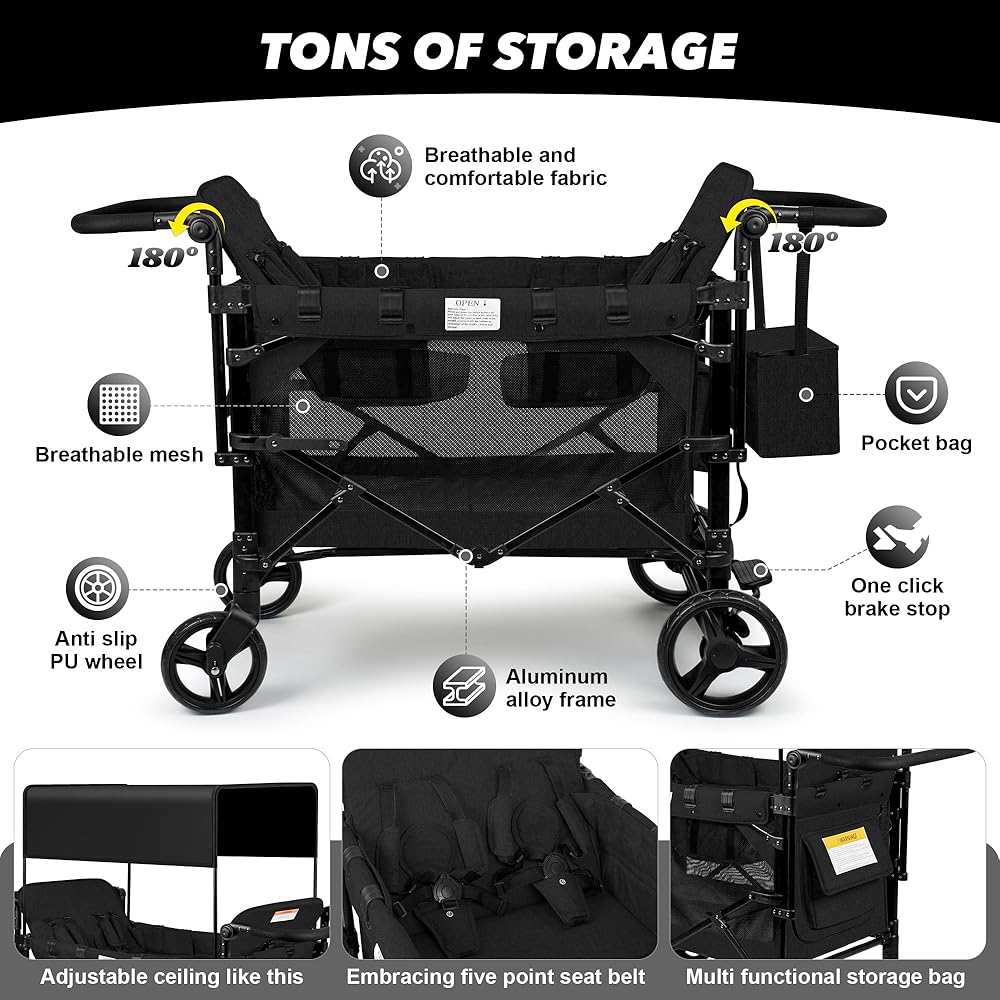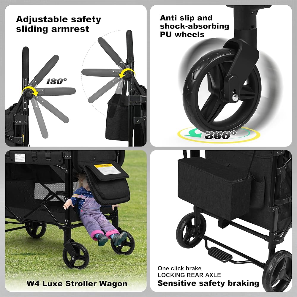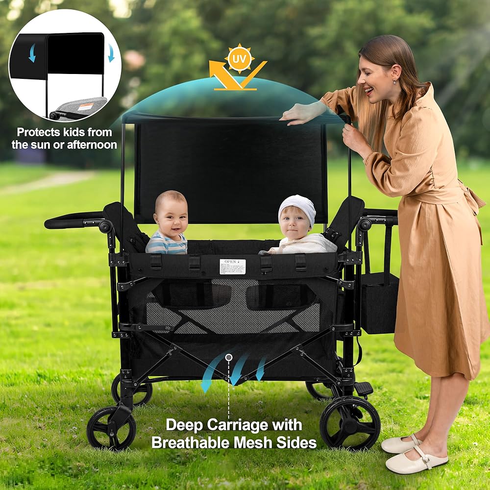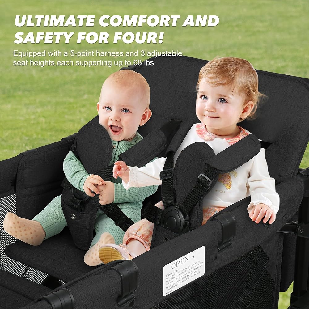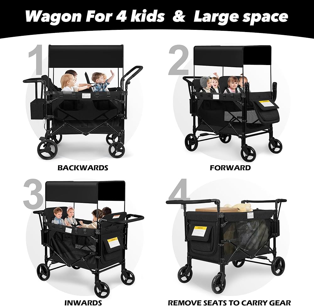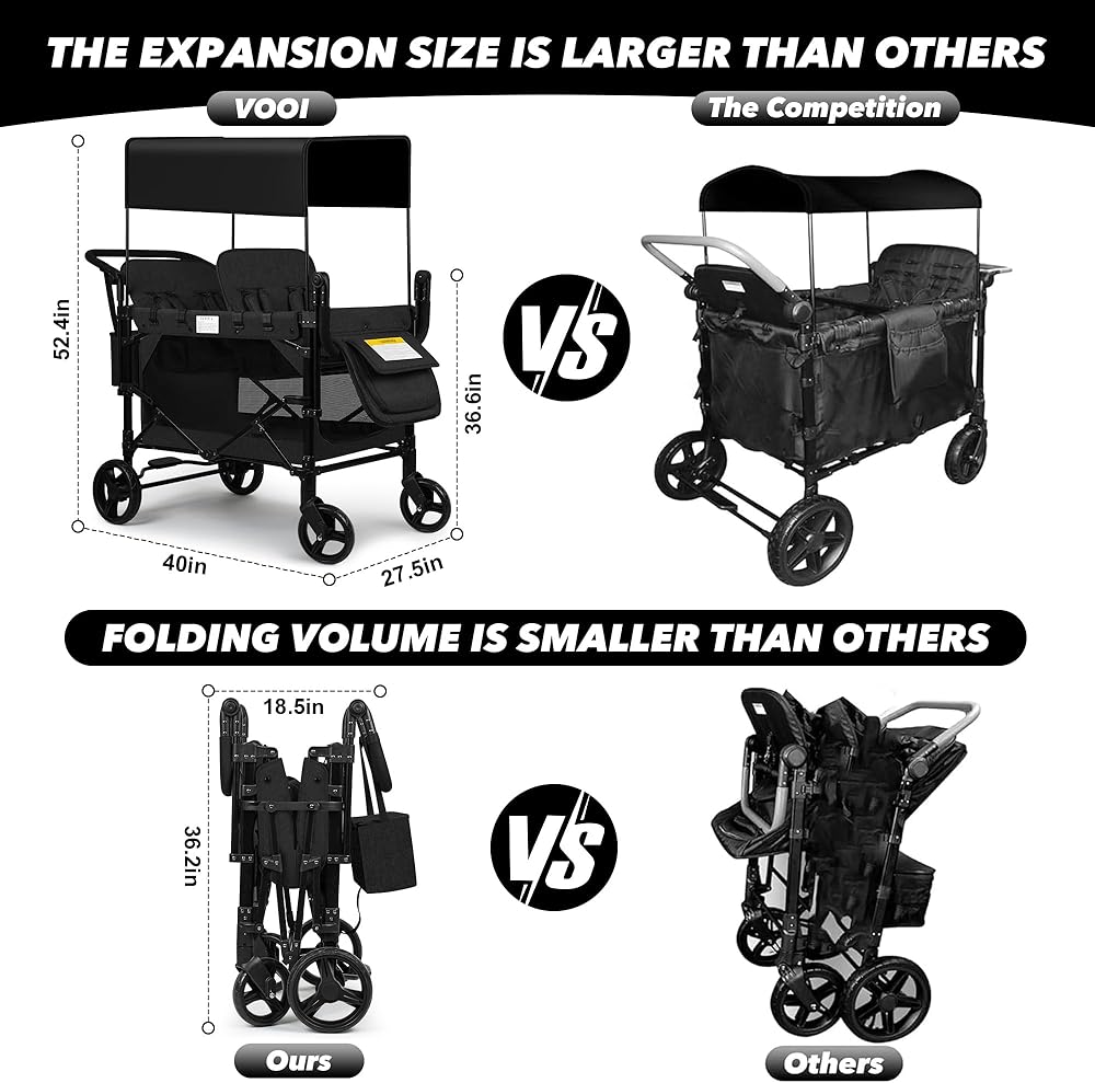 Vooi Stroller Wagon 4 مقعدًا ، عربة للأطفال ، عربة W4 قابلة للطي مع مقاعد مع تسخير 5 نقاط ، باب سحاب سهل الوصول ، ومظلة الشمس القابلة للإزالة (أسود ، W4-large)