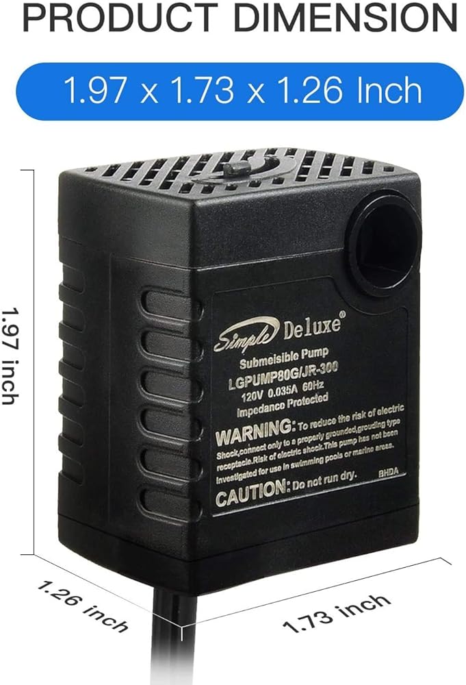 Specs Dimensions: 4.45*2.76*3.94inch. Max flow rate: 800 GPH (3000L/h), max lift height: up to 10 feet. Watt:24W; voltage:110-120V.