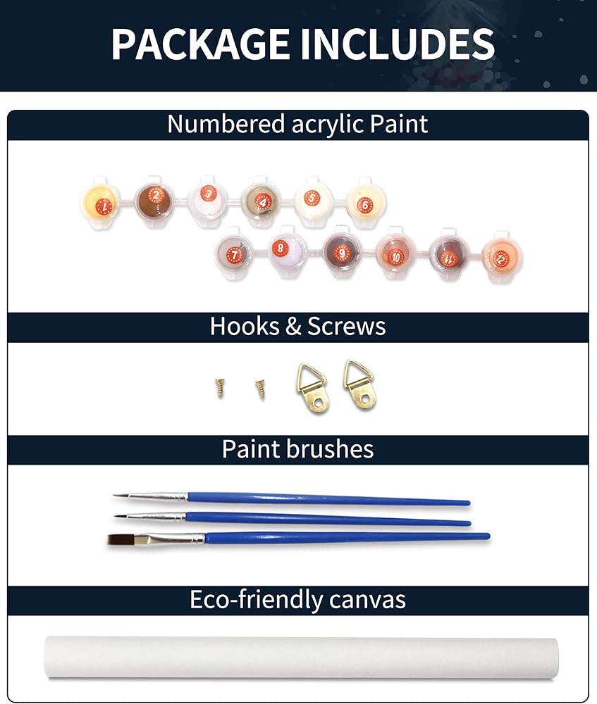 • شملت المعبأة: لوحة قماشية متميزة من 4 قطع ، 4 مجموعة من الدهانات الأكريليك ، 4 مجموعات من السنانير والمسامير ، 4 مجموعات فرش متعددة الحجم ، 41 قطعة نسخة ورقية للرجوع إليها. نحن نقدم ما يكفي من الدهانات الأكريليك ، ولكن إذا كنت تفتقر إلى إنهاء اللوحة الخاصة بك ، فلا تتردد في مراسلتنا عبر البريد الإلكتروني.