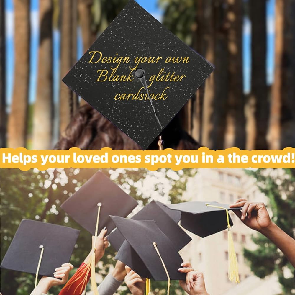 This graduation topper serves as the perfect base and comes in the standard cap size of 9 by 9 and the tassel whole is cut, you can add anything you want, such as Rhinestones, flowers, and butterflies and more
