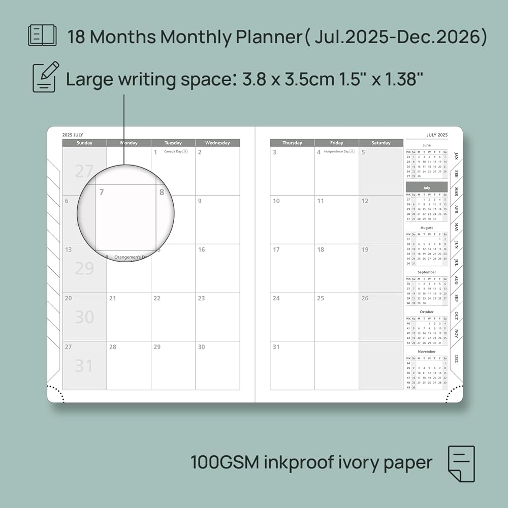 تقويم شهري لمدة 18 شهرًا: يضم صفحات من (20125 يوليو-ديسمبر-2026) مع أرقام الأسبوع والأعياد المميزة ، فإن هذا المخطط مثالي للتخطيط على المدى الطويل. يغطي كل شهر انتشارًا من صفحتين مع ملاحظات منتشرة وتتبع النفقات لمساعدتك في إدارة المواعيد النهائية والأهداف بكفاءة.