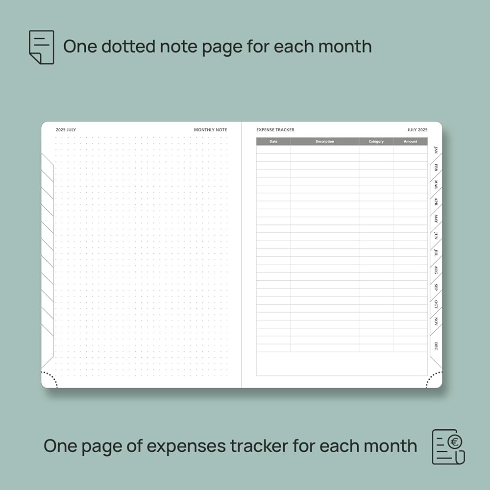 إضافات مدمجة: تتيح لك علامات التبويب الشهرية التنقل بسرعة وتحديد موقع التاريخ الحالي. تساعد الزوايا المدمرة وشرائط الإشارة المرجعية في تحديد الصفحات المهمة ، في حين أن الإغلاق المرن يضمن بقاء مخططك مغلقًا بشكل آمن. بالإضافة إلى ذلك ، يوفر الجيب القابل للطي مساحة مثالية لتخزين الملاحظات والإيصالات والمستندات المهمة.