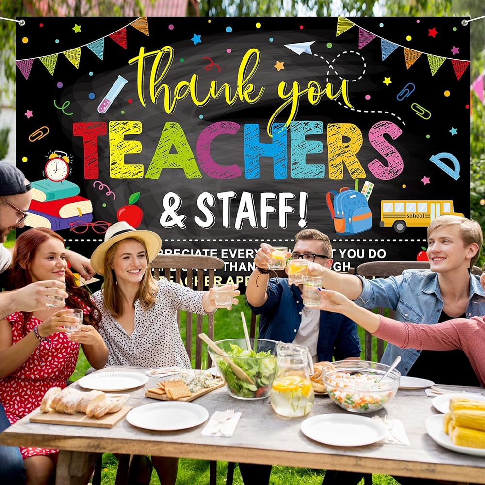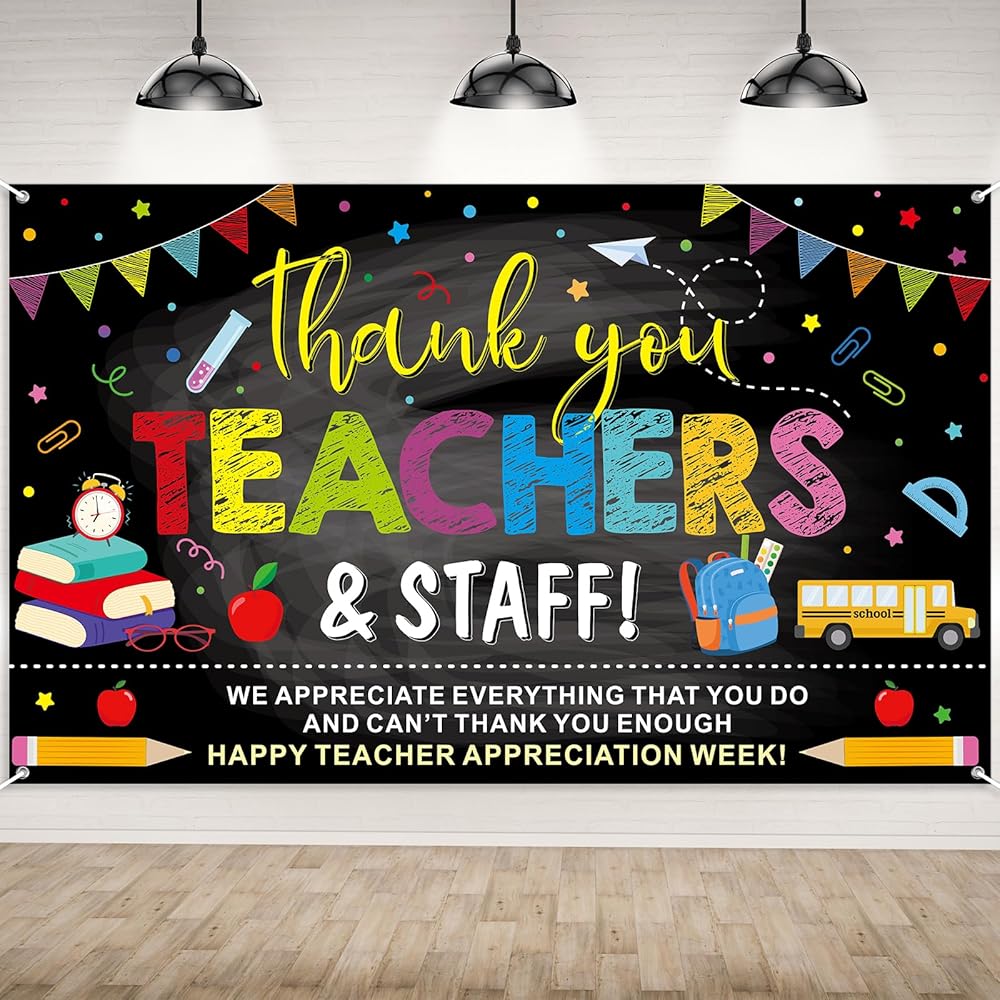 Featuring a chalkboard-style background with colorful text, school supplies, and festive bunting, this thank you teachers and staff banner delivers a warm and appreciative message. Its bold and eye-catching design enhances any celebration, creating a cheerful and inspiring atmosphere.