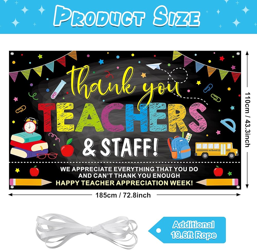 Show gratitude to educators with this teacher appreciation banner! This set includes one high-quality polyester banner, measuring 72.8” x 43.3”, along with a 19.6ft hanging rope for easy installation, making it a perfect addition to your Teacher Appreciation Week decorations or any celebration honoring teachers and staff.