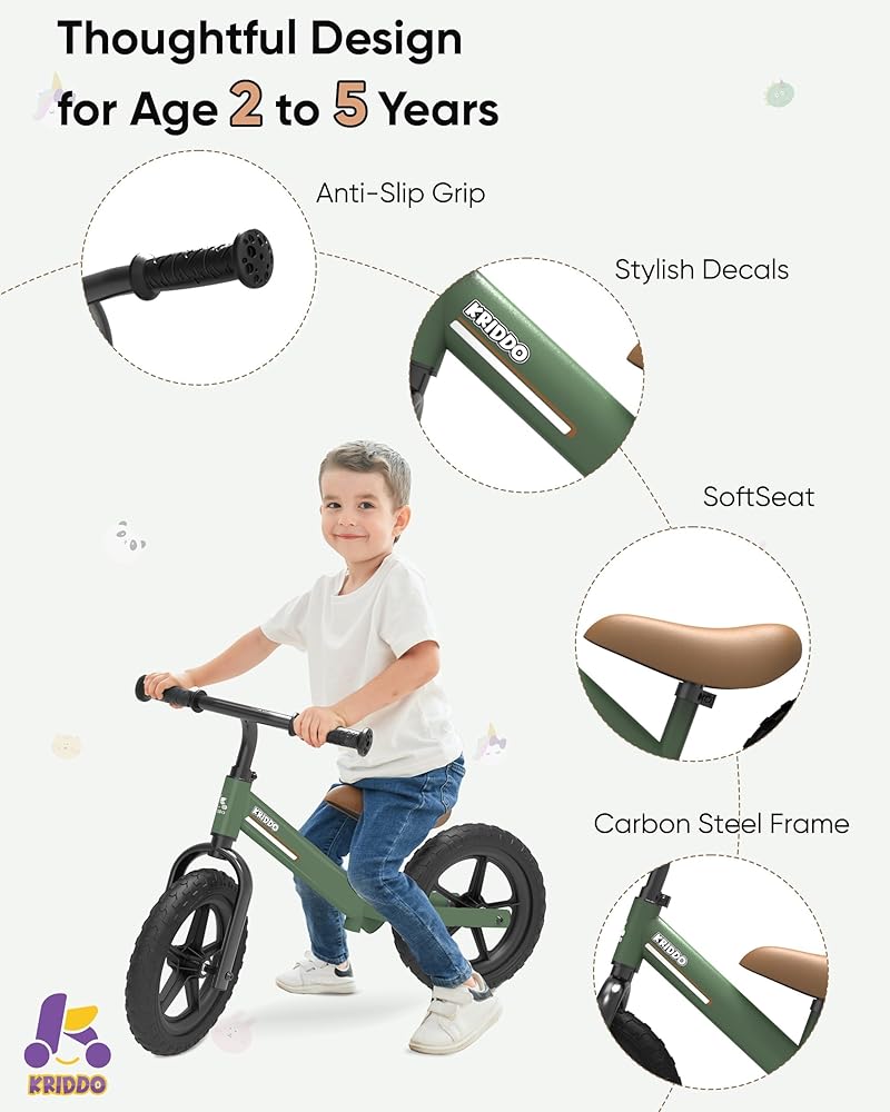 دراجة توازن للأطفال من KRIDDO بعمر عامين، دراجة توازن للأطفال بعمر 2-5 سنوات، محمل مزدوج لركوب أكثر سلاسة، لوحة رائعة، مقعد قابل للتعديل ومقود، هدايا دراجة للأطفال بعمر 2-3 سنوات، أسود
