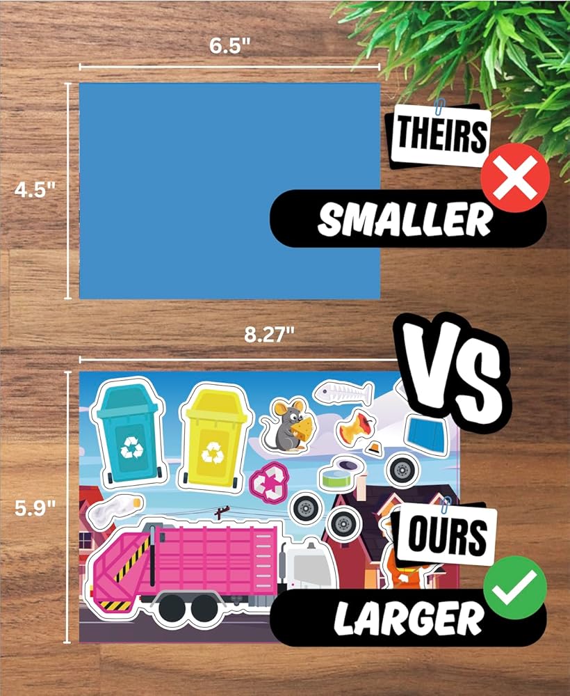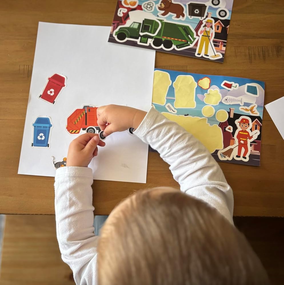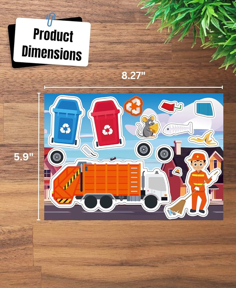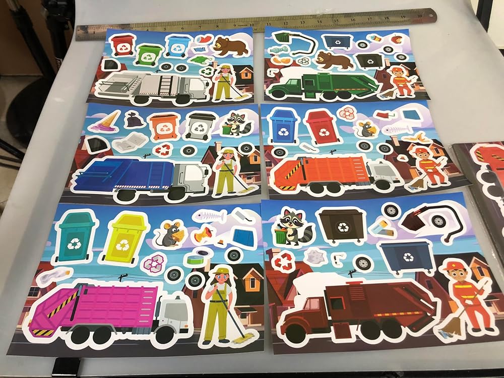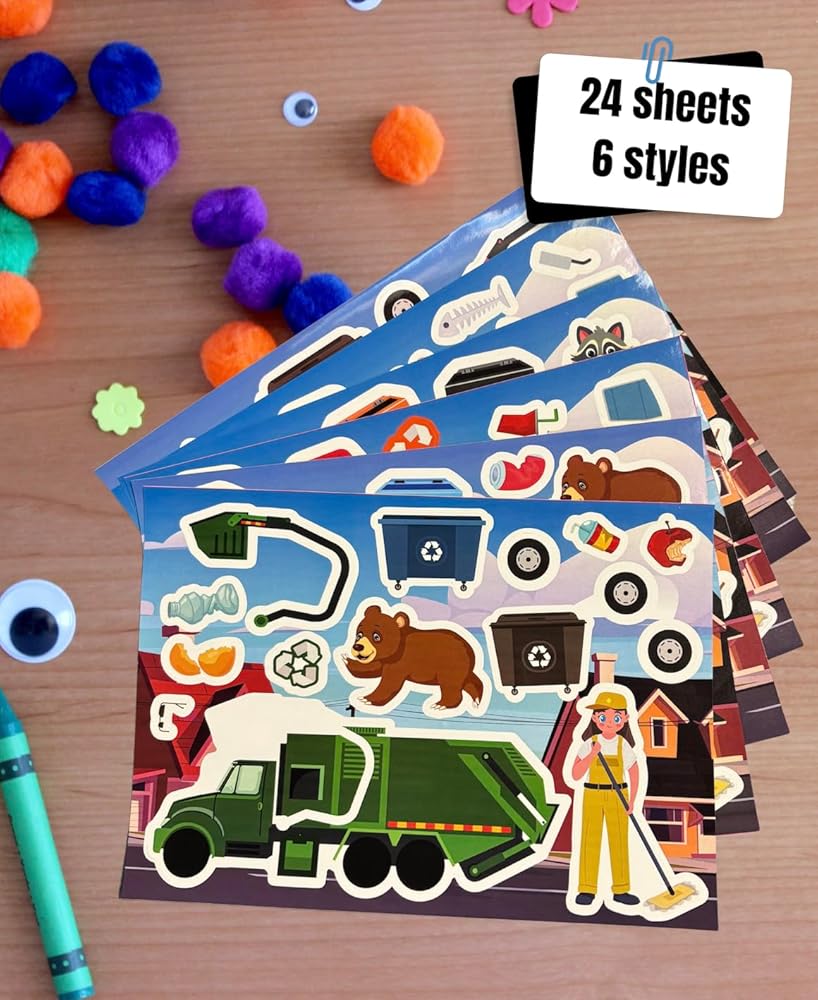 • PACKAGE CONTENTS: Set includes 24 sticker sheets featuring 6 garbage trucks variations with related designs for endless creative play and activities
