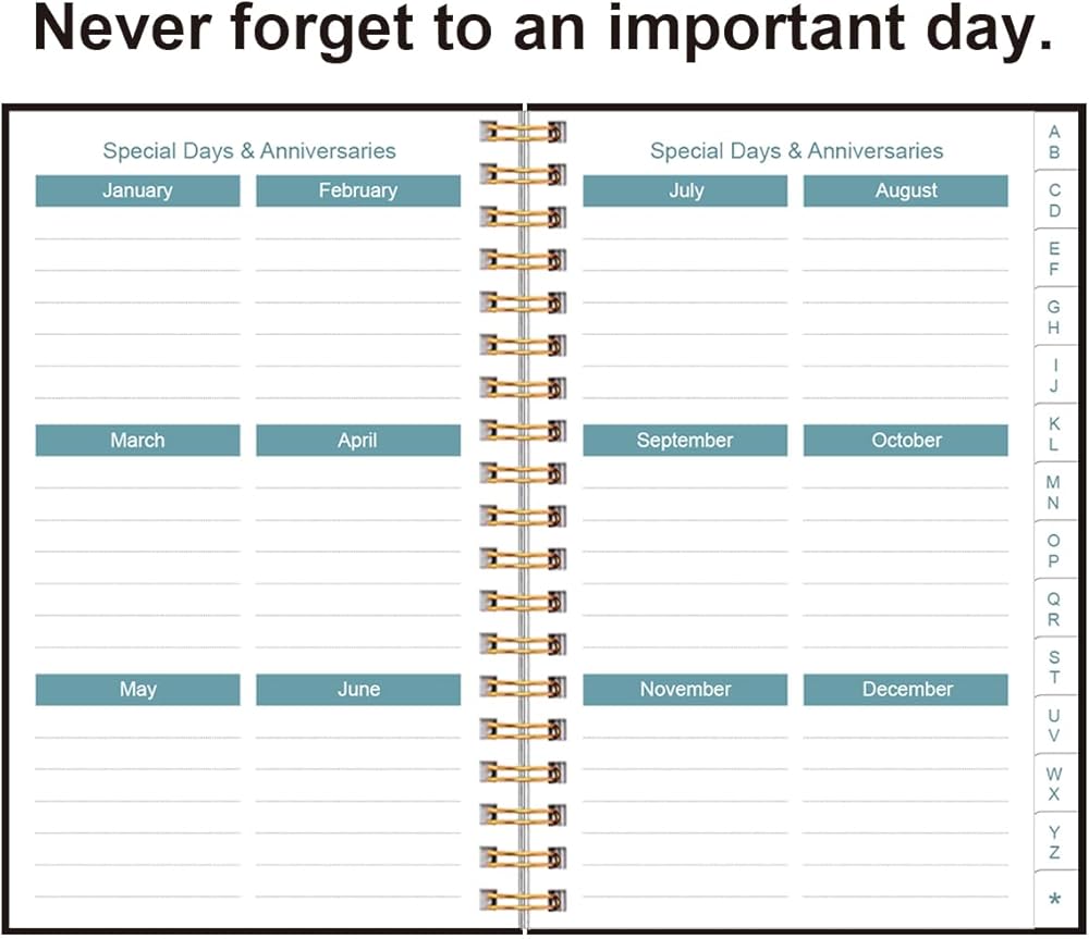 This address book allows you to store all your address, telephone, birthday, specila dates & web login password.The information used to protect you will never be forgotten. The address notebook cover is lovely teal look, golden spiral bound design. The telephone address & birthday book size of 4.3" x 6.2" , is used to high quality 120gsm pure white paper for easy writing and reducing ink leakage. A total of 64 sheets(128 pages) 1 person infomation page, 12-month special days & anniversaries, 3 entries per page for telephone, address & birthday, total 291 entries, 4 entries per page for password, 10 pages, total 40 entries for password, and 10 pages notes section. make sure you have enough space for you record important information. Spiral bound address organizer book with alphabetical tab you can locate need addresses quickly