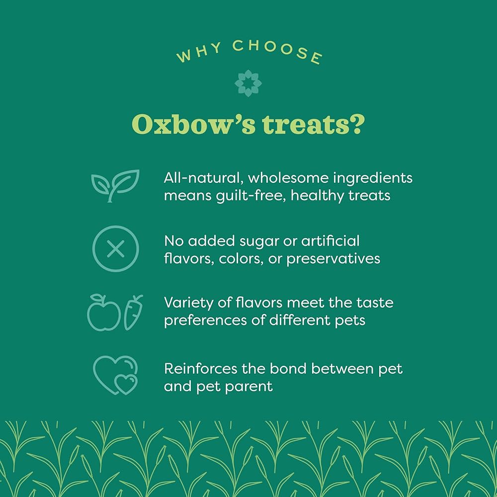 At Oxbow Animal Health, our purpose is to help people and pets live happy, healthy lives. For more than 30 years, we've partnered with leading veterinarians and nutritionists to develop nutrition and care products that meet the specific species and life stage needs of rabbits, guinea pigs, chinchillas, hamsters, gerbils, rats, and mice. From farm fresh hays and nourishing fortified foods to wholesome treats, beneficial supplements, enrichment and care, Oxbow products are used and recommended by leading veterinary professionals and passionate pet parents worldwide. Oxbow Simple Rewards Oven Baked with Cranberry Small Animal Treats are a wholesome, oven-baked blend of ingredients including cranberries and high-fiber timothy hay that provide a tasty, enriching snack. They are low in calcium and protein with a balanced protein-to-fiber ratio and no artificial color or preservatives.