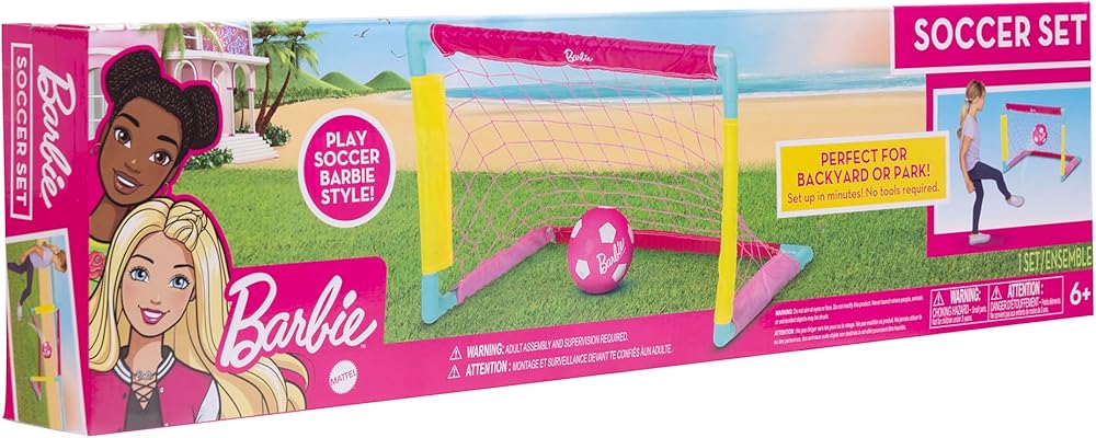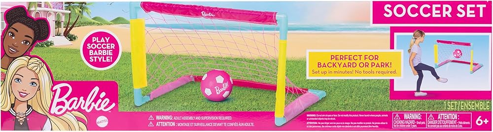 Complete Barbie Soccer Set – Includes 1 goal, 1 Barbie soccer ball, and 1 water bottle for active outdoor or indoor fun.