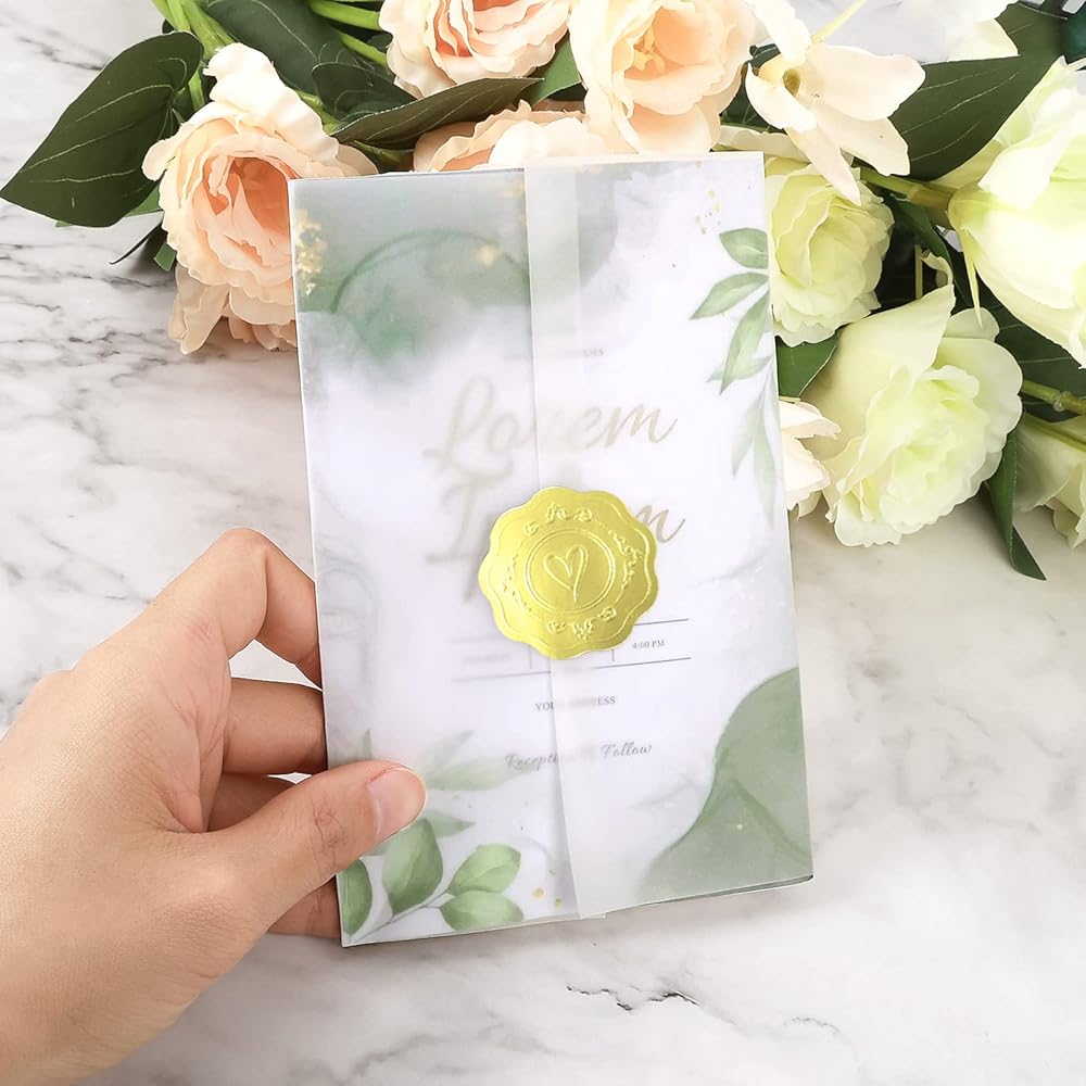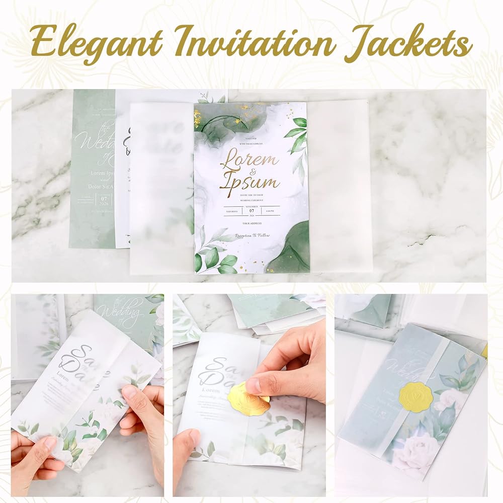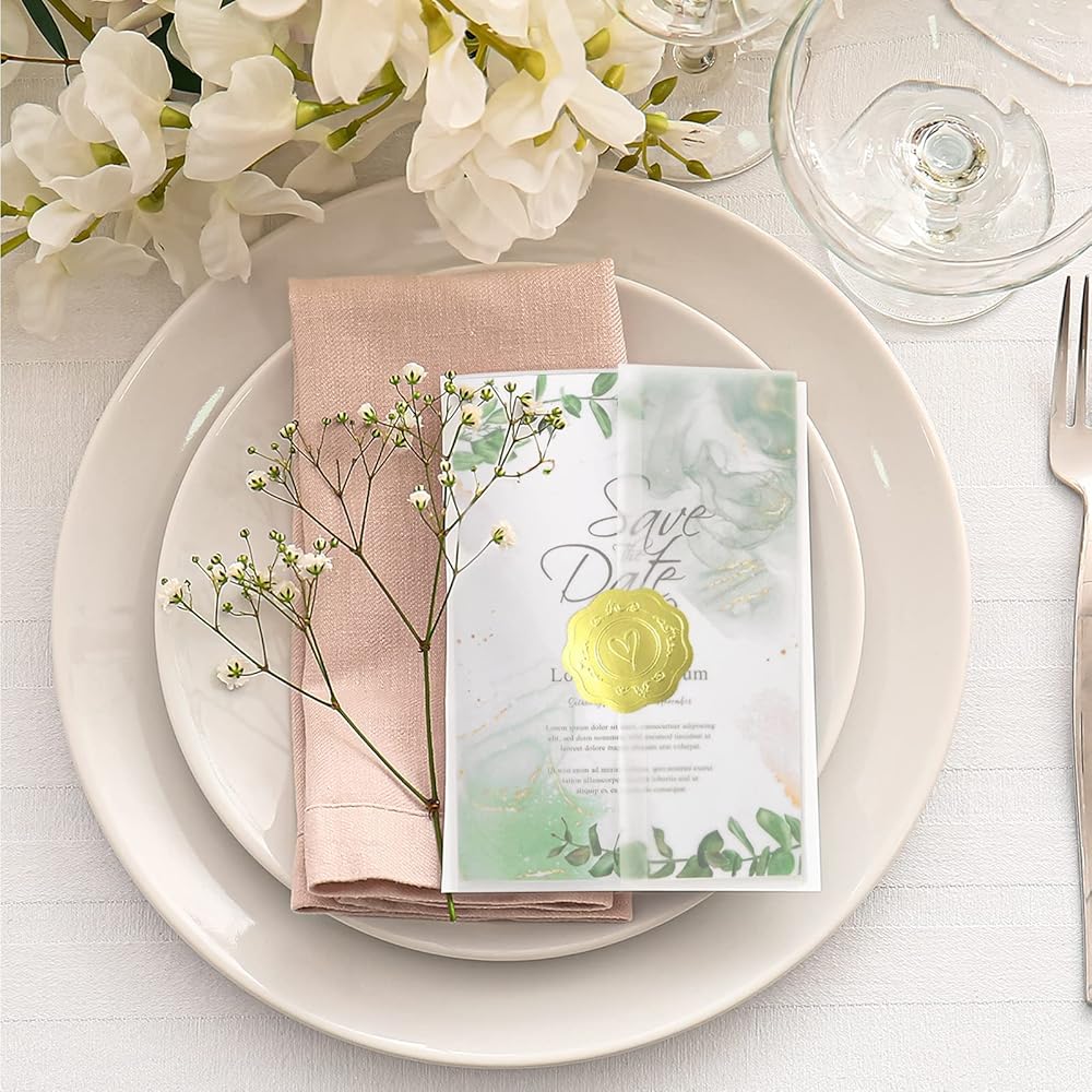 أنيق وجميل: ورق الرق الشفاف أنيق وفاخر مع ملصقات الإغلاق. كما يمكنك تزيينها بشريط لجعل الدعوات أكثر جاذبية