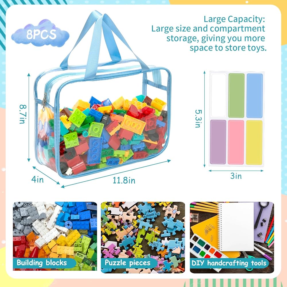 8 حزم 8 ألوان أكياس تخزين ألعاب كبيرة مع سحاب وعلامات ، واضحة أكياس ألعاب مقاومة للماء PVC لألعاب الطاولة ، وقطع الألغاز ، وبنات البناء ، والملحقات المصنوعة يدويًا ، وكتب للأطفال