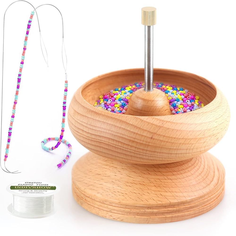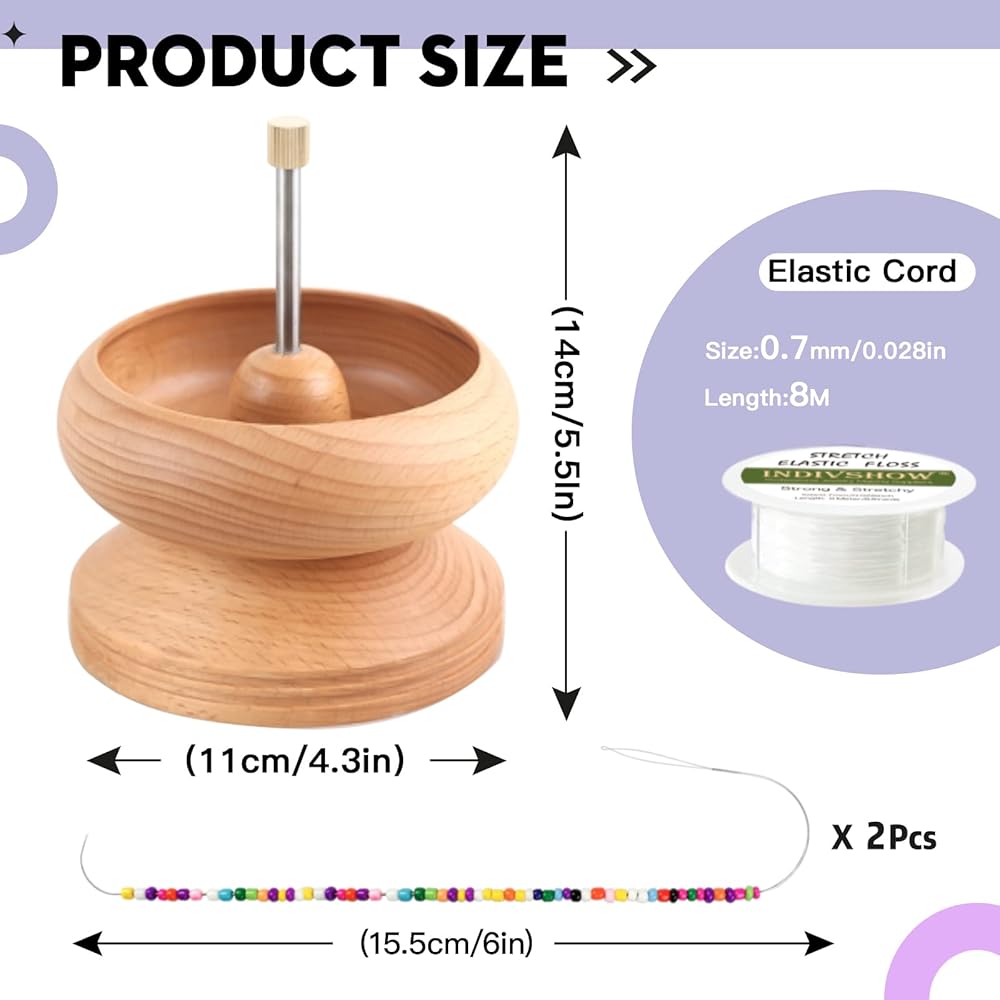 مجموعة خرز خشبية كبيرة دوارة: تتضمن أداة تدوير خرز خشبية، إبرتين خطافين منحنيين، خيط ولفة خيط مرن 0.8 ملم.