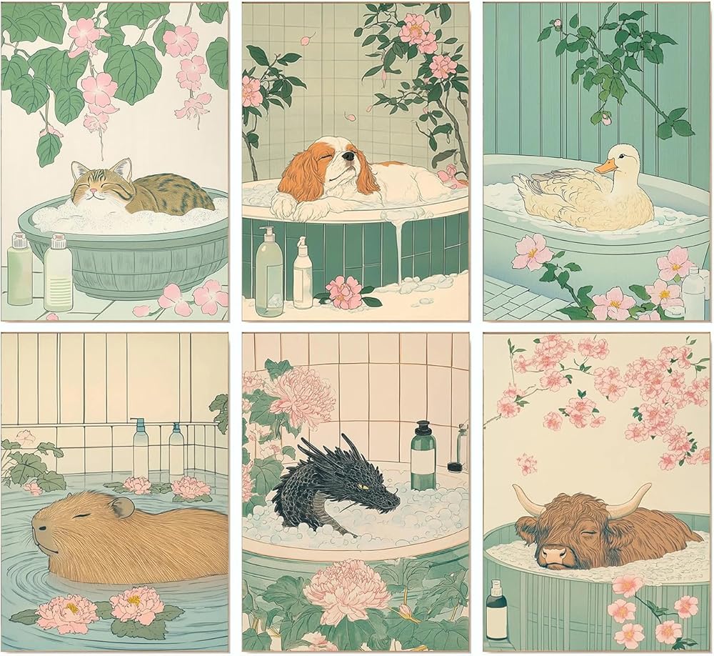 مجموعة كليندو 6 قطع من الحيوانات في حوض الاستحمام بالأرقام للبالغين - مجموعة طلاء للبالغين عتيقة حسب الأرقام على القماش الفنون اليدوية للبالغين فن جدار الحمام مضحك (10 × 14 بوصة)