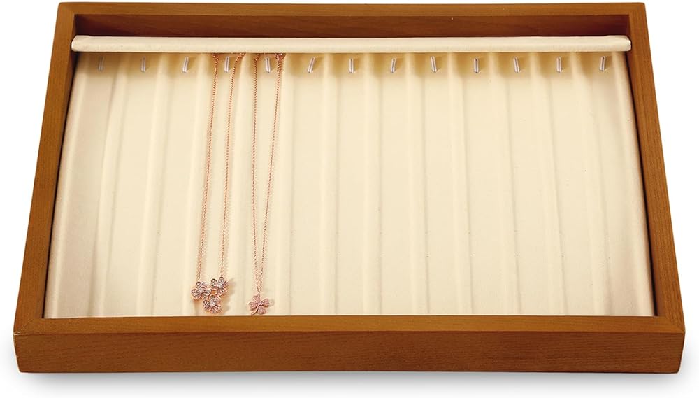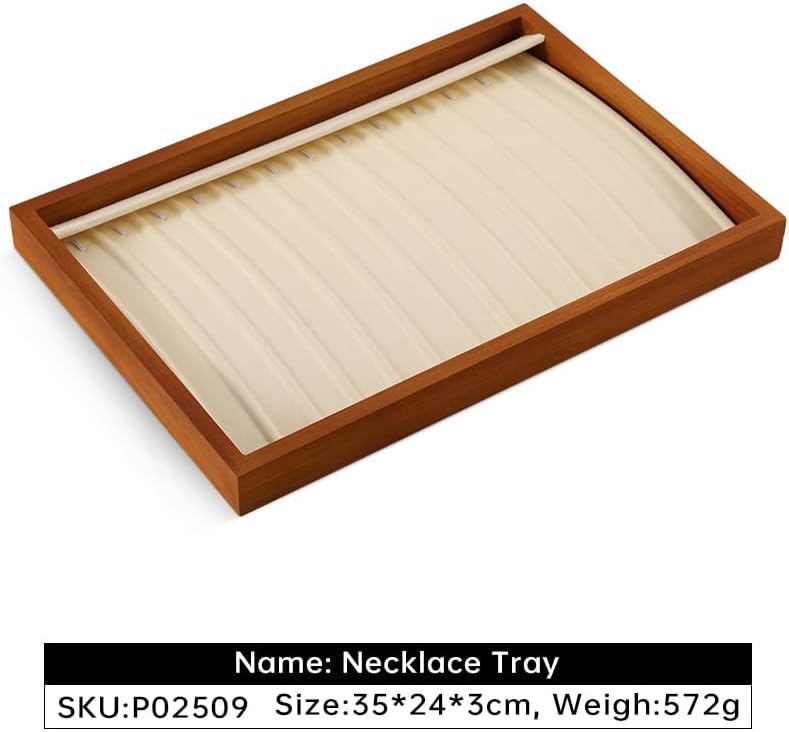 Specification: 1Pcs Jewelry Display Tray Color: beige&gray Material: solid wood+microfiber The weight and size are as shown Features: 😊Exquisite Craftsmanship: Yinbeini vintage wooden jewelry display tray is made of exquisite woodworking craftsmanship, with a solid structure and strong durability, showing an elegant appearance, providing a high-quality display and storage platform for your jewelry. 😊Meticulous Care: The microfiber storage box can gently protect your jewelry from scratches and damages, providing meticulous care for your jewelry. 😊Careful Layout: The tray is well-designed to effectively display various types of jewelry while keeping it neat and orderly, adding a sense of professionalism to your product display. 😊Multiple choices: There are six types of trays that can be freely selected according to the needs, meeting the storage needs of different types and sizes of jewelry. Package: 1Pcs Necklace Display Stand, Jewelry Not Included. 😊Whether you are displaying in a jewelry store or another retail store, it can provide an eye-catching display for your items. It is also suitable for personal use, it provides a safe and beautiful way to display your earrings. Package: 1Pcs Jewelry Display Tray, Jewelry Not Included