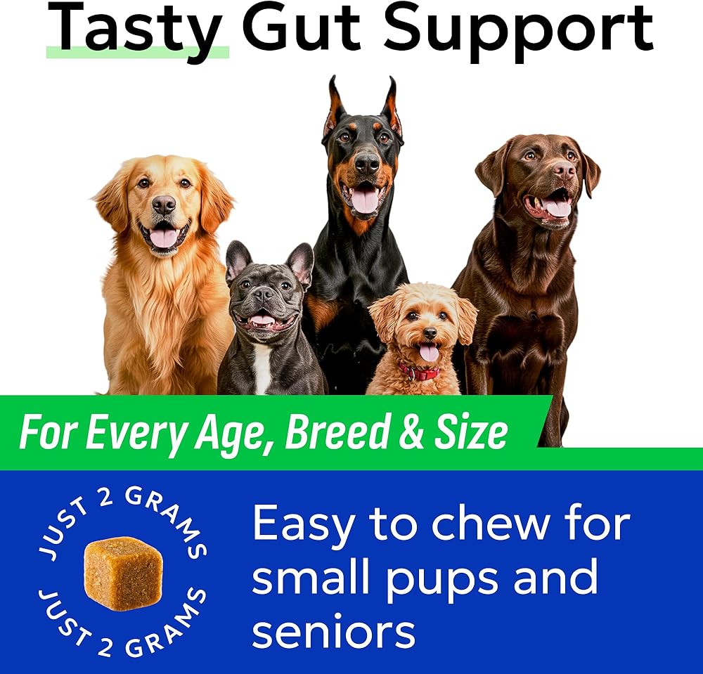 Help your buddy take control over sensitive stomach issues with Pumpkin Fiber + Vet Strength Probiotic Chews We combined one billion CFU probiotics per serving with fiber rich pumpkin seeds and enzymes to create an all-in-one digestion support supplement, easing most if not all digestion issues like constipation, diarrhea, gas, upset stomach and more. Chewable treats will also help improve digestion, stool quality and consistency in pets bowl movement. Full Health benefits of Dog Probiotics: - Support digestion - Ease upset stomach - Gas remedy - Anti diarrhea meds - Coprophagia treatment - Improve appetite - Boost immune - Food allergy relief - Improve stool quality. Dog probiotic treats are suitable for all breeds, sizes and ages, from puppies to older dogs. Recommended serving: Serve with each meal, amount based on dog's weight: Up to 20 lbs. - 1 chew, 21 to 40 lbs. - 2 chews, 41 to 80 lbs. - 3 chews, 81 lbs. and over - 4 chews. Strictly follow recommended servings.