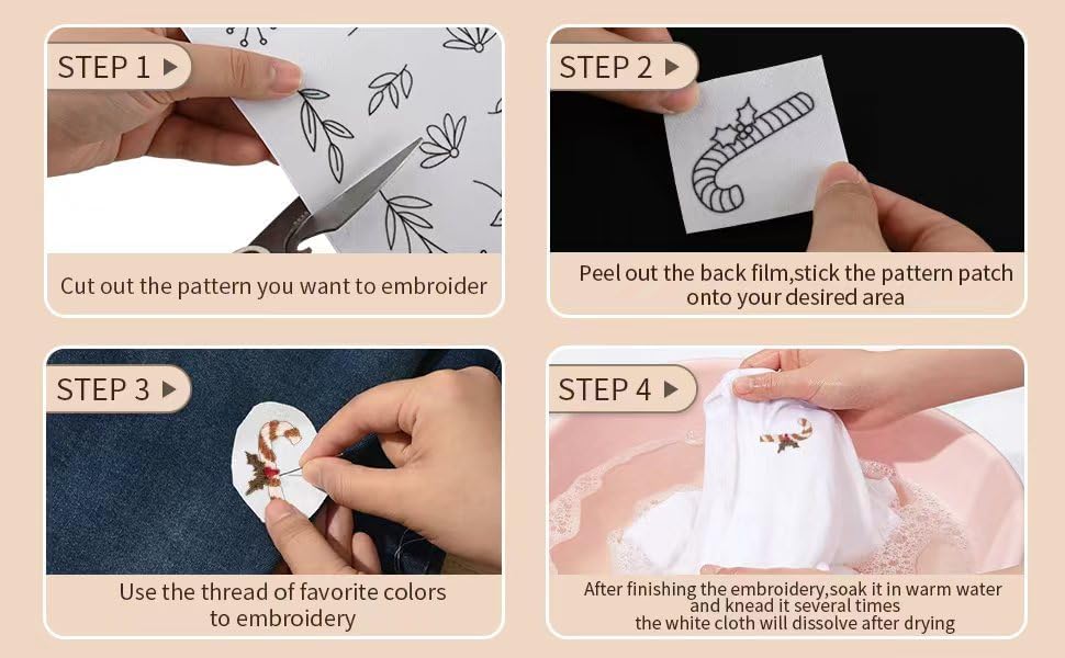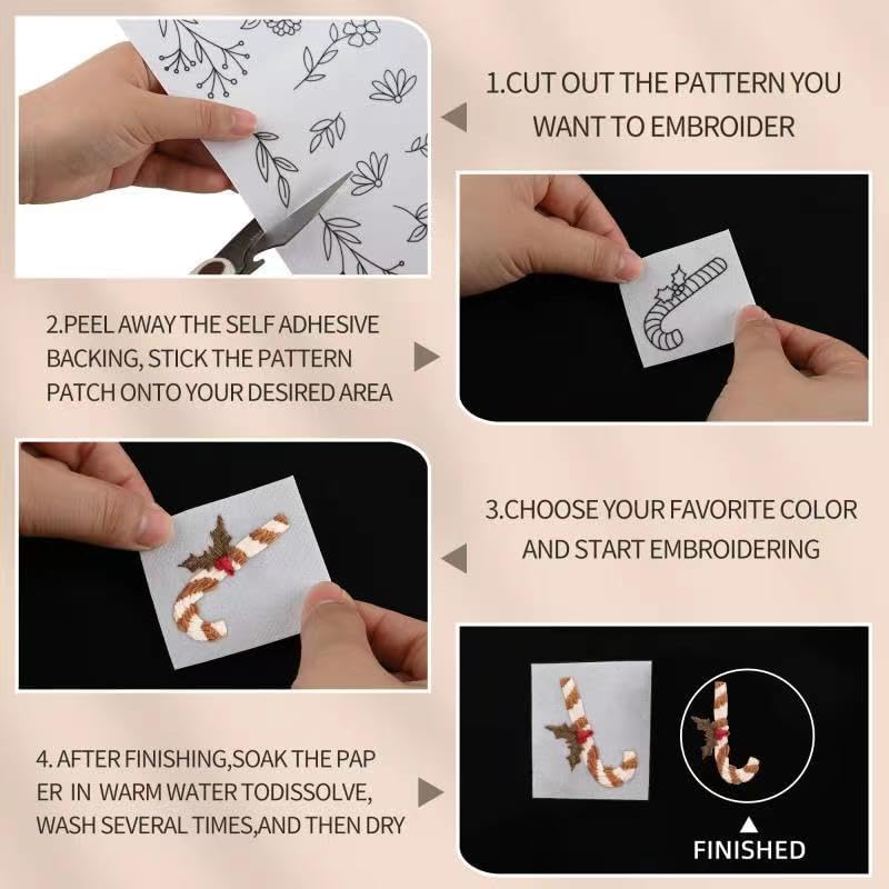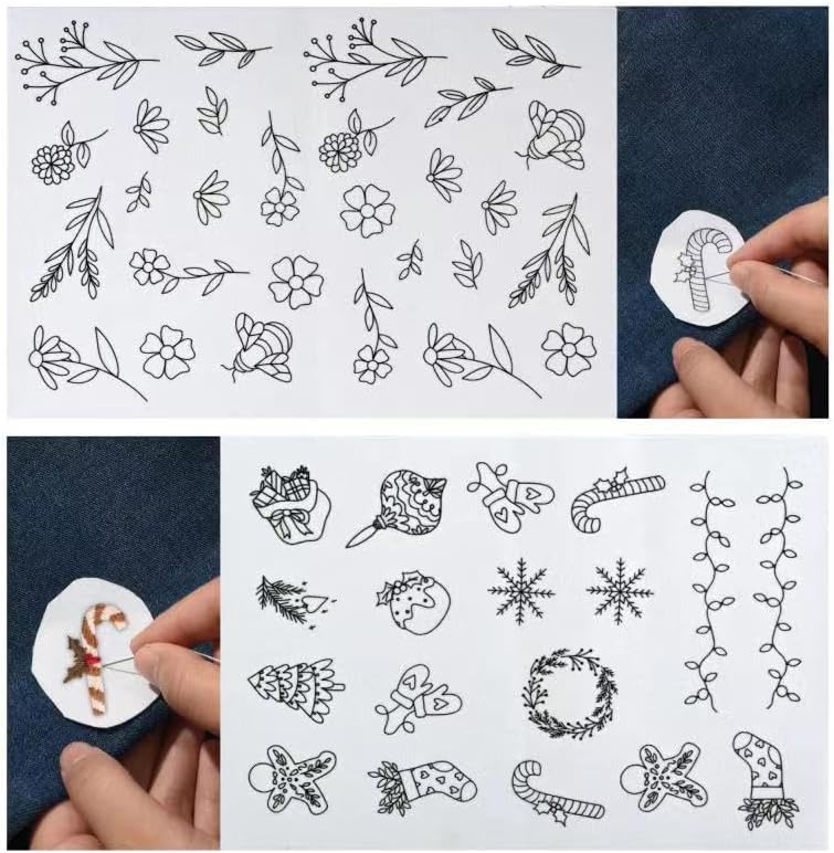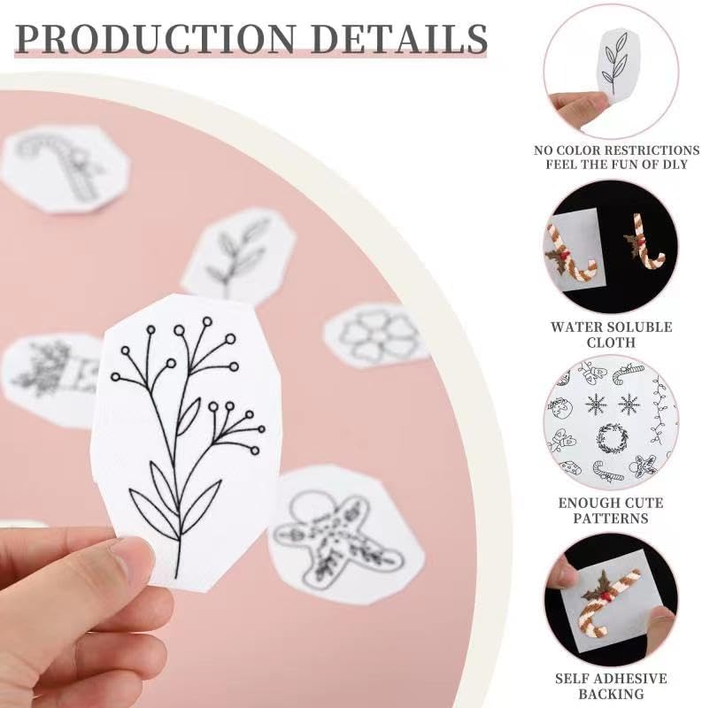 38 قطعة من مثبتات الخياطة اليدوية، مثبتات قابلة للذوبان في الماء، مثبتات ذاتية اللصق وقابلة للغسل، مع زهور مطبوعة مسبقا وأنماط عيد الميلاد، مناسبة للمبتدئين في التطريز اليدوي